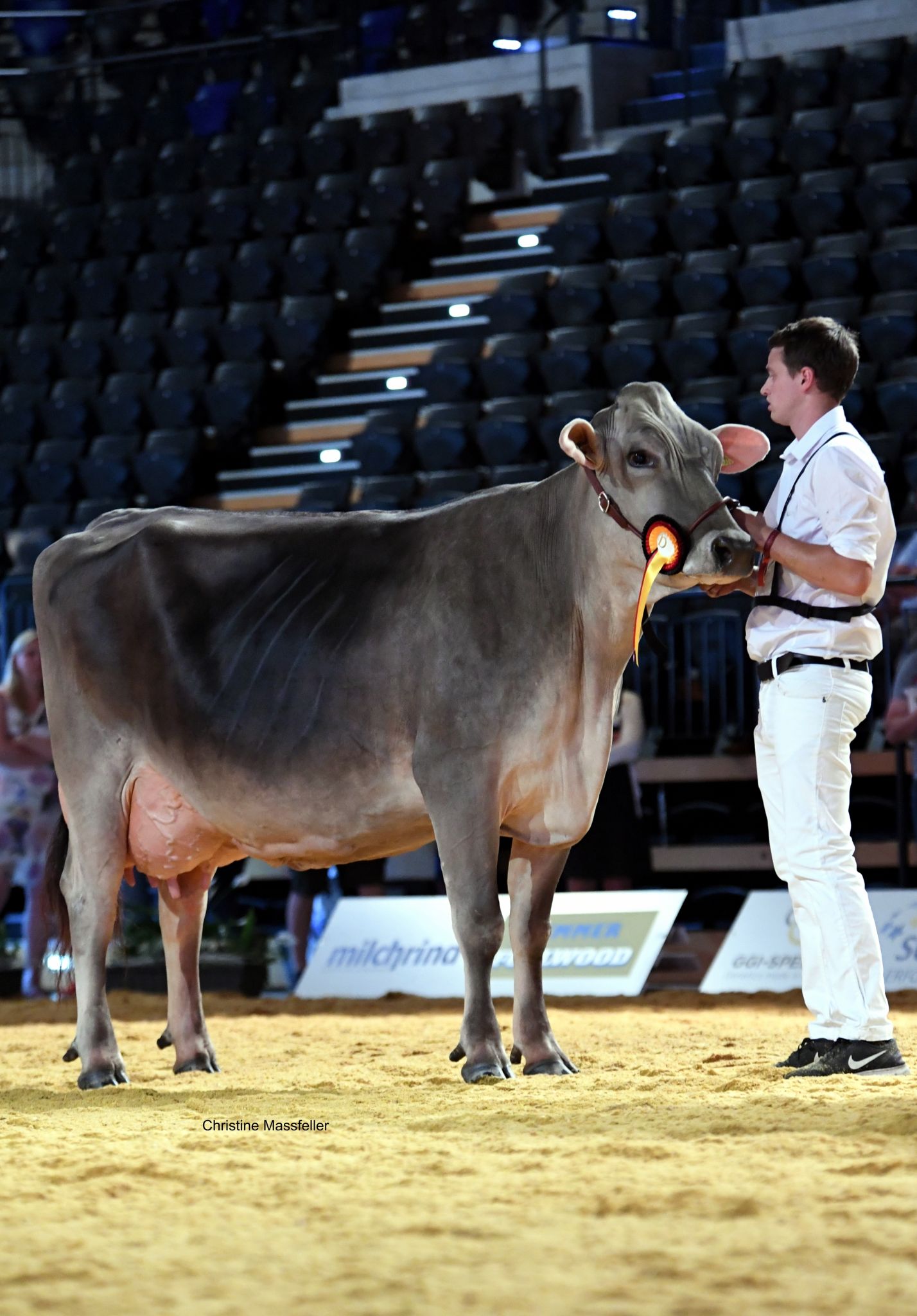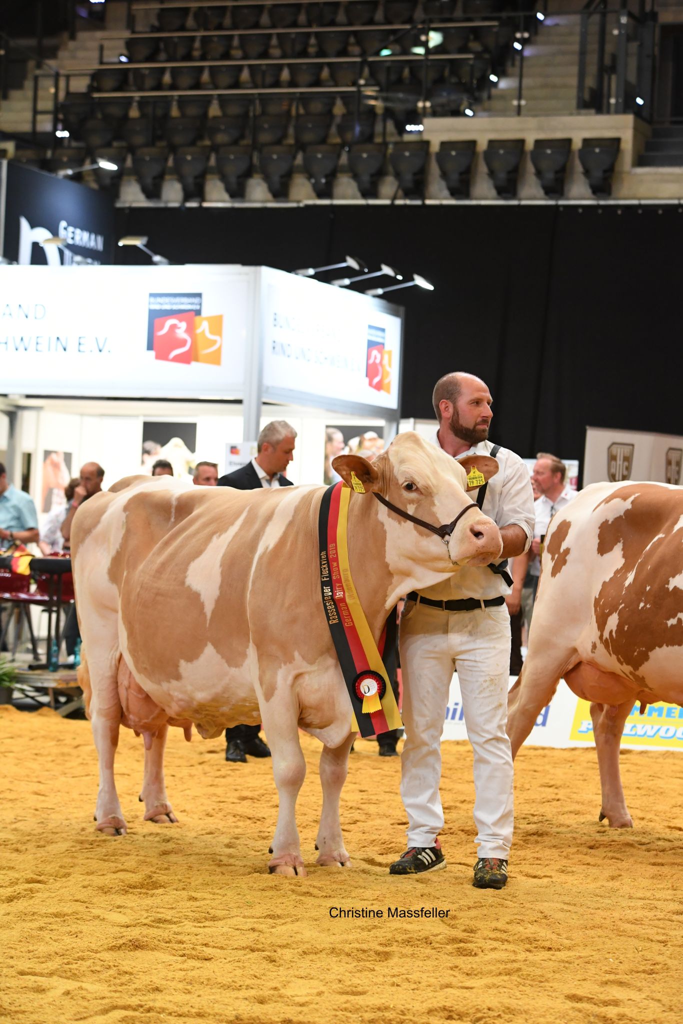 With outstanding elegance, the extremely strong Erafax daughter Fuchsi (owner: Bernhard Fuchs GbR, Argenbühl-Eglofs) entered the ring for the Brown Swiss cows and confidently secured class victory. This was followed by the overall victory - Judge Grabner was too enthusiastic about her performance. He accompanied her with the youthfully elegant and typey Jucator daughter Uganda by R. Thönes and A. Kuppel from Kalkar-Grieth.