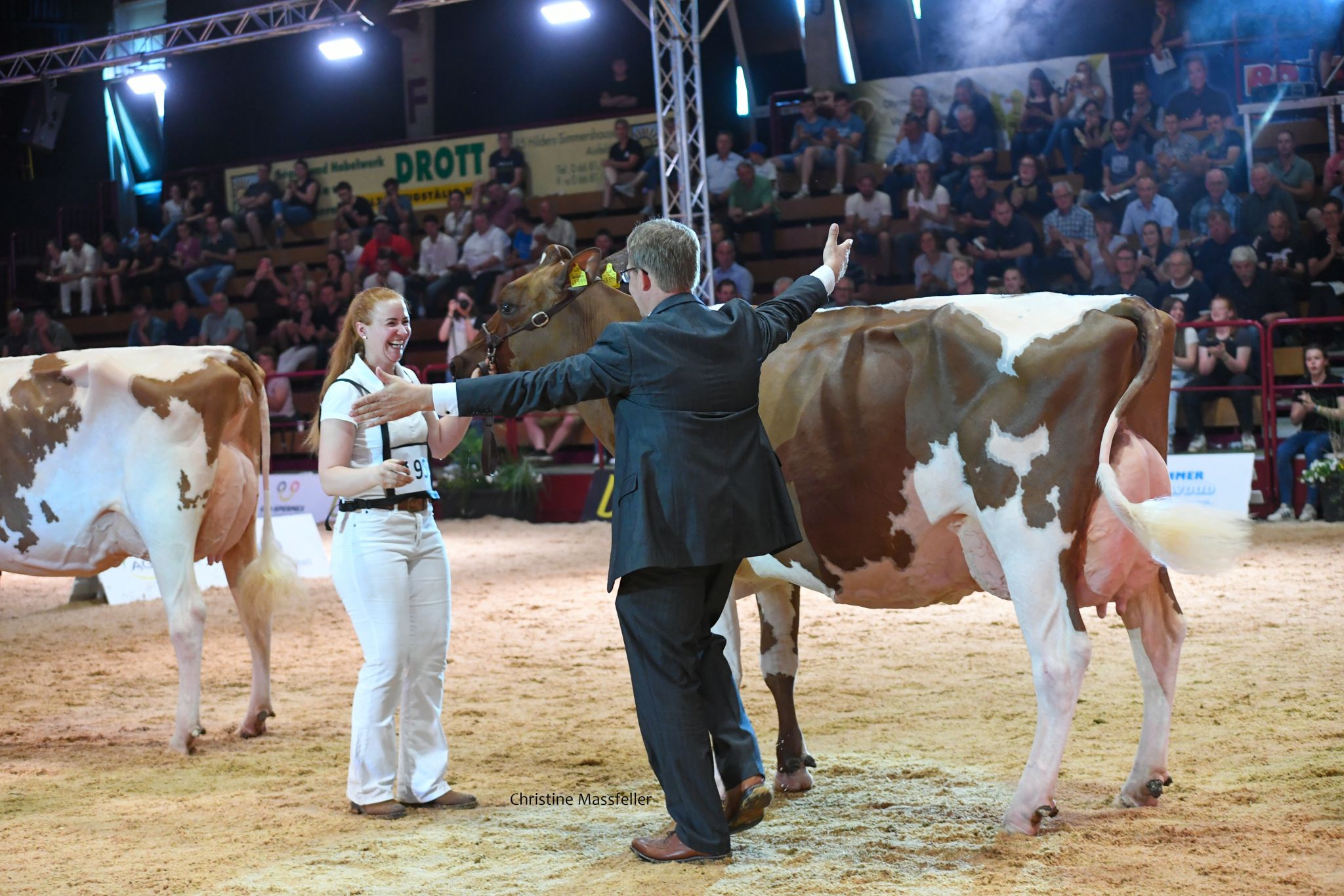 With this comment he opened the selection of the young cow champion. He awarded the title to Ralf Hellmuth's Amby (Gold Chip x Kite) who he described as a very complete cow with a lot of balance, strength in the forehand, a wide middle hand and a very good transition from the fore udder to the belly. He made Fux Spotify (Gold Chip x Doorman) from Hahn/Radke GbR the reserve winner. She comes from the family of Fux Seattle EX-97 and combined harmony in body with a great udder and good rump position. Hannen justified the choice of Amby with a plus in style as well as advantages in feet and legs.