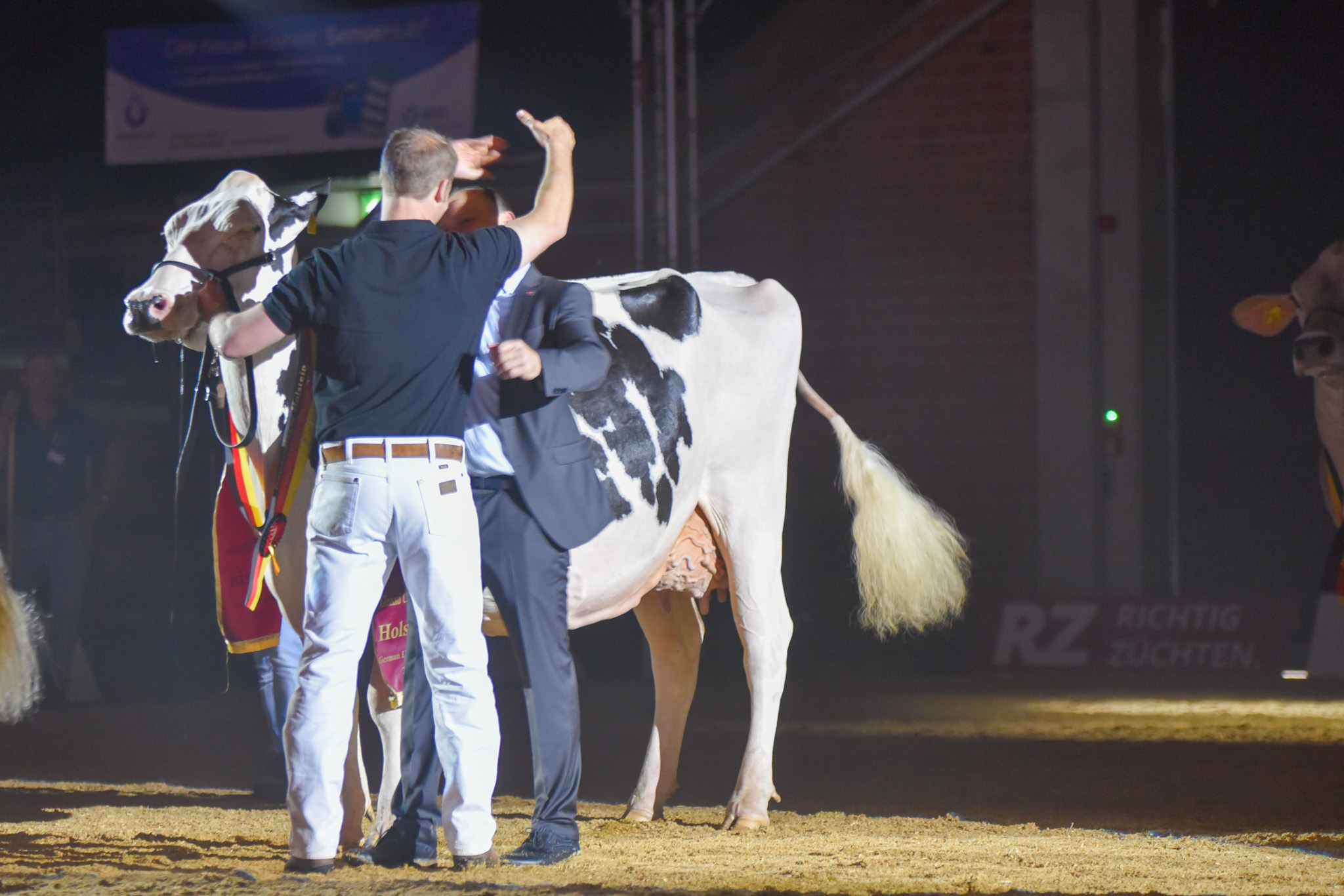 The medium cow winner was chosen from the cows with three calves. The decision was made between Searose (Montross x Atwood) from Friedrich Köster and Elina (Chief x Sea) from Cord Hormann. Hannen had already declared the latter as the clear winner in her class and praised her for her fluent motion, high and wide rear udder and width from forehand to rump. The capital cow Searose scored with harmony, a great side view, a closed middle hand and excellent teat placement. Elina was able to secure the place on the winner's podium due to a little more width in the rear udder and relegated Searose to the rank of reserve winner.