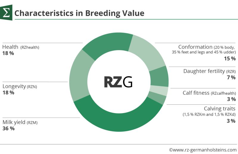Since April 2021 the RZG (relative total breeding index) is published in a new combination. The RZG includes the most important traits for the Holstein breed. In particular, the health breeding values (RZhealth and RZcalfhealth), which have been increasingly influencing bull selection on farms since their introduction in 2019, are now directly taken into account. In the past, the cows' health has been included in the RZG via secondary traits such as the RZS (somatic cell score), the RZR (daughter fertility) and the RZN (longevity).