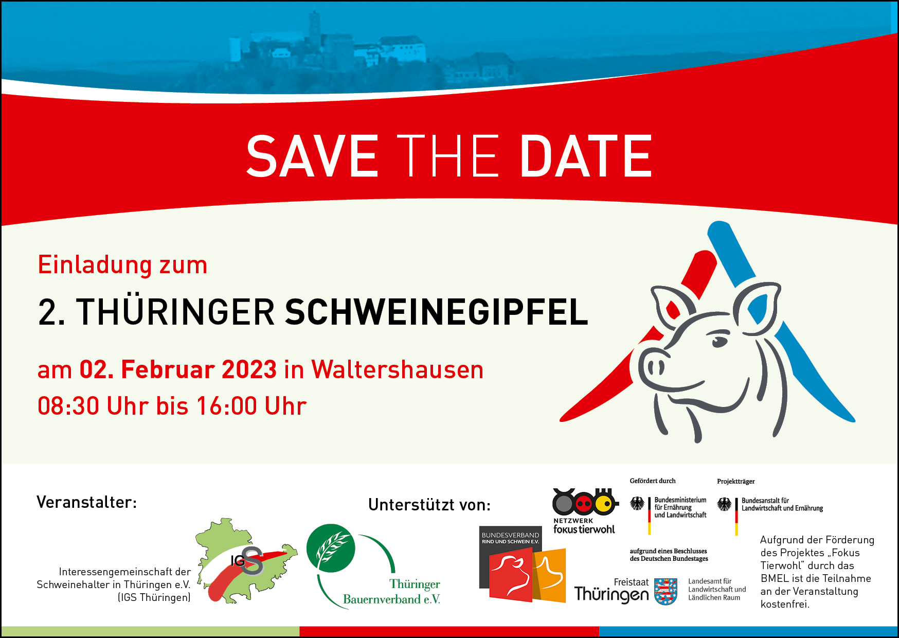 Die Interessengemeinschaft der Schweinehalter in Thüringen e.V. und der Thüringer Bauernverband e.V. laden in Zusammenarbeit mit dem Bundesverband Rind und Schwein, dem Netzwerk Fokus Tierwohl sowie dem Thüringer Landesamt für Landwirtschaft und Ländlichen Raum am 2. Februar 2023 von 9.45 – 16.00 Uhr ins Freizeitzentrum Gleis3Eck, Steinbachstraße 18 in 9880 Waltershausen zum 2. Thüringer Schweinegipfel ein. Thematisiert wird der Umbau der Schweinehaltung in Deutschland. Bisher übliche Produktionsbedingungen, die Größe der Bestände, Tierwohl und Tiergesundheit werden kritisch hinterfragt, oft ablehnend diskutiert und Veränderungen gefordert. Sich verändernde Anforderungen münden in hohe Investitionen und gefährden die Wirtschaftlichkeit der Betriebe. Im Rahmen der Veranstaltung soll über diese Situation diskutiert werden, um den fachlichen und gesellschaftlichen Ansprüchen an den Tier- und Umweltschutz entsprechen zu können und trotzdem wettbewerbsfähig zu bleiben. Aufgrund der Förderung des Projektes Fokus Tierwohl