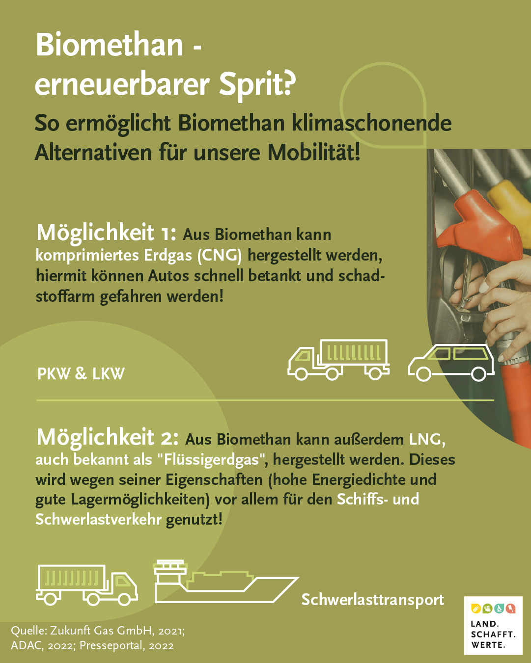 Wird Biomethan in einer Aufbereitungsanlage unter Druck gesetzt, entsteht gasförmiges CNG. CNG kann dann ins bestehende Erdgasnetz eingespeist werden. Fährt man ein Auto mit Gas-Antrieb kann man das CNG an der Tankstelle tanken. Der Unterschied ist hier: CNG muss im Gegensatz zu Bio-CNG nicht zu 100% aus Biomethan bestehen. CNG hat auch Anteile von herkömmlichem Erdgas. Wird Biomethan auf -161 bis -164 Grad heruntergekühlt, entsteht flüssiges LNG. LNG wird wegen seiner hohen Energiedichte im Schwerlastverkehr (Schiff, LKW, Traktoren) genutzt und nicht im PKW-Bereich genutzt. Besteht das flüssige Gas zu 100% aus Biomethan, so darf es Bio-LNG genannt werden.