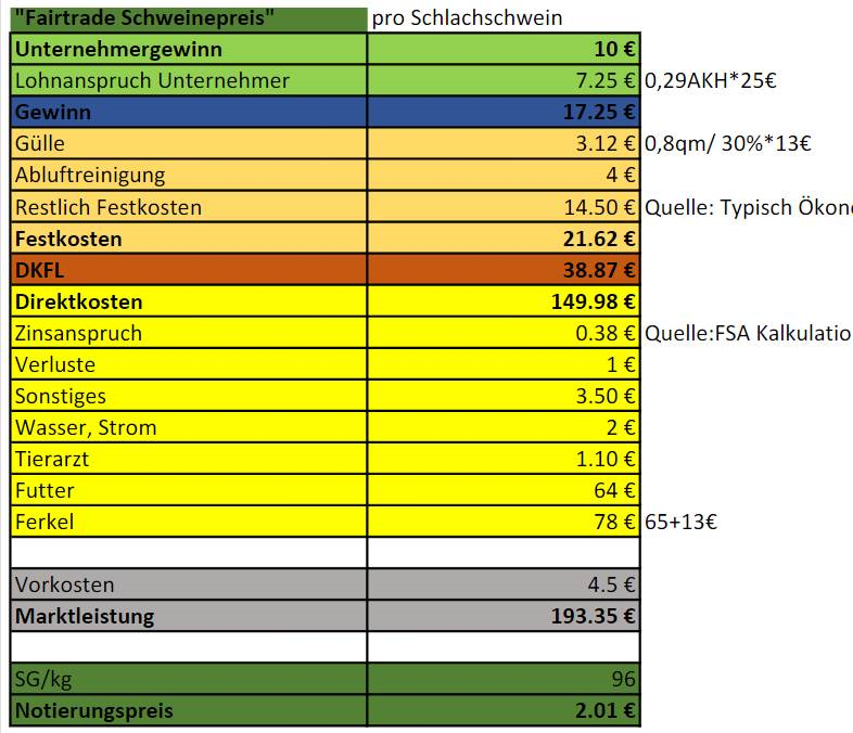 . Der müsste nach deren Berechnung bei €/kg 2,60 für Ferkel (30 kg € 78,00) und €/kg 2,01 für Schlachtschweine liegen, rechnen die angehenden, staatlich geprüften Wirtschafter vor. Dabei sind die Schüler von den Gestehungskosten ausgegangen und haben hierfür die Produktionsdaten durchschnittlicher Ferkelerzeuger- und Schweinemastbetriebe in Intensivgebieten berücksichtigt. Sowohl den Ferkelerzeugern wie auch den Schweinemästern wurde ein Unternehmergewinn von €/Ferkel 5,00 und €/Mastschwein 10,00 eingestanden, um die Arbeitsentlohnung mit geringen €/h 25,00 erwirtschaften zu können. Die Daten für Gülle und Abluftreinigung basieren auf realistischen, aktuellen Praxiskosten. Die Direktkosten wurden aus den aktuellen Futterkosten in der Schweinemast und dem Fair Trade Ferkelpreis