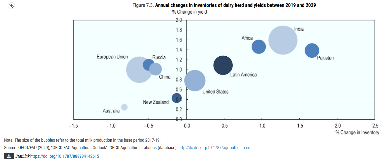 Die weltweite Milchproduktion stieg 2020 auf fast 906 Millionen Tonnen, ein Plus von 2,0 Prozent gegenüber 2019, angetrieben durch Produktionssteigerungen in allen geografischen Regionen, außer in Afrika, wo die Produktion stabil blieb. Der Anstieg der Milchmenge war in Asien am höchsten (plus 2,6 % auf 379 Millionen t.), gefolgt von Europa (plus 1,6 % auf 236 Mill. t.), Nord- und Südamerika, Ozeanien sowie Mittelamerika und der Karibik. FAO und OECD gehen von jährlichen Steigerungen in Höhe von rd. 1,6 % aus, so daß im Jahr 2030 fast eine Milliarde Tonnen Milch als hochwertige Nahrung zur Verfügung stehen.