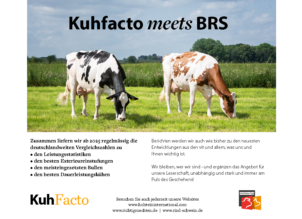 Nationale Toplisten der besten Leistungskühe und -betriebe, aktuelle Übersichten über die am höchsten eingestuften Färsen und Kühe, diverse Statistiken zu Trends in der Besamung, Interviews zu aktuellen Themen oder Hintergrundberichte über die neuesten Entwicklungen der Zuchtbranche inklusive Neuerungen in der Zuchtwertschätzung bildeten über drei Jahrzehnte den Kern des Inhalts des ehemaligen nationalen Zuchtmagazins milchrind. Nach dessen Einstellung vor zwei Jahren wurde ein Teil dieser Informationen über die neu entwickelten und über die Verbandsmagazine veröffentlichten Infos aus BRS und vit publiziert. Die Veröffentlichung nationaler Listen sowie ausführlicher Hintergrundberichte erfolgte über die Homepages von BRS und seiner Mitgliedsverbände. Da diese Form der Veröffentlichung in der äußeren Wahrnehmung vieler Holsteinzüchter und -verbände an seine Grenzen stieß, kam der Wunsch auf, die Reichweite dieser exklusiven nationalen Zuchtinformationen über eine Medienpartnerschaft mit einer in Deutschland erscheinenden Zuchtzeitschrift zu erhöhen. Nach Verhandlungen mit verschiedenen Verlagen haben sich die entsprechenden BRS-Mitgliedsverbände für eine Medienpartnerschaft mit dem Magazin KuhFacto aus dem Verlag Holstein International entschieden. Die Partnerschaft, die eine enge Kooperation in der Veröffentlichung nationaler und exklusiver Informationen vorsieht, beginnt am 1. Januar 2025. Die Medienpartnerschaft wird einen Beitrag dazu leisten, die Reichweite der BRS/vit-Informationen zu erhöhen und dem Informationsauftrag der deutschen Holstein-Verbände nachzukommen.