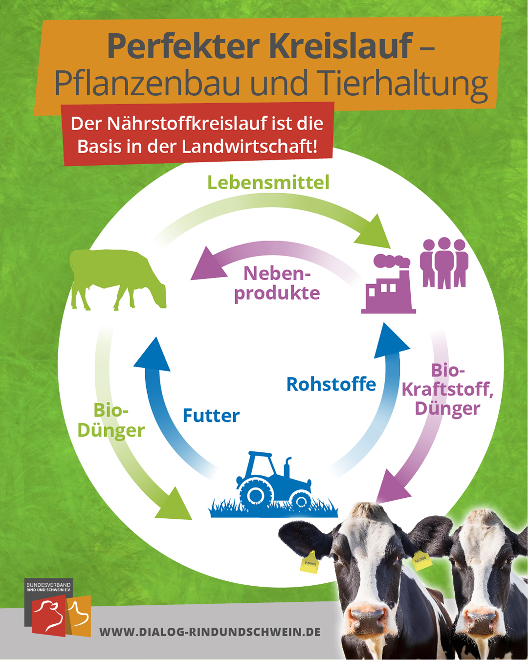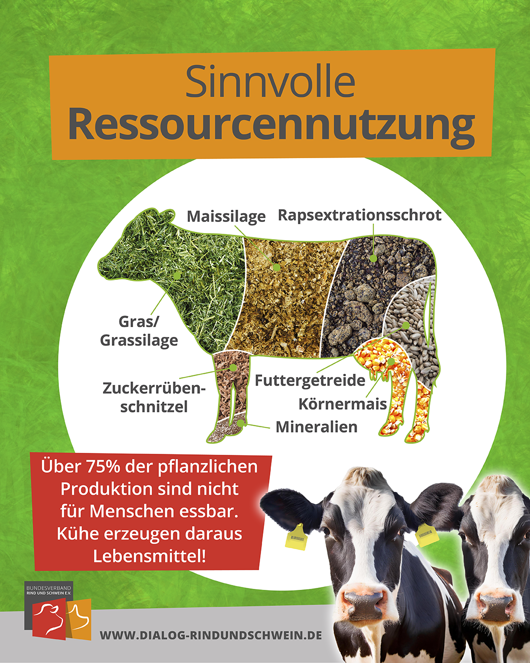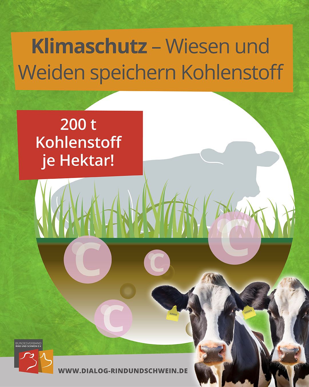 Die verdauten Pflanzenteile sind als Dung auf den Feldern ein idealer Pflanzennährstofflieferant und ermöglichen die Einsparung mineralischer Dünger. Somit ist eine Landwirtschaft ohne Rinderhaltung undenkbar! Rinder machen Grünlandflächen für die Nahrungsmittelproduktion nutzbar, da sie das Gras dieser Flächen verdauen können. Rund 30 Prozent der landwirtschaftlichen Nutzfläche in Deutschland sind Wiesen und Weiden, die zumeist aus geografischen oder naturschutzfachlichen Gründen nicht als Ackerland genutzt werden können. Grünlandflächen sind effektive Kohlenstoffspeicher und somit wichtig für den Klimaschutz. Ein Hektar Dauergrünland, das sind 10.000 Quadratmeter, speichert bis zu 200 Tonnen Kohlenstoff! In Deutschland wären das rd. 940 Mio. Tonnen. Das entspricht rd. 3,4 Milliarden Tonnen CO2.*