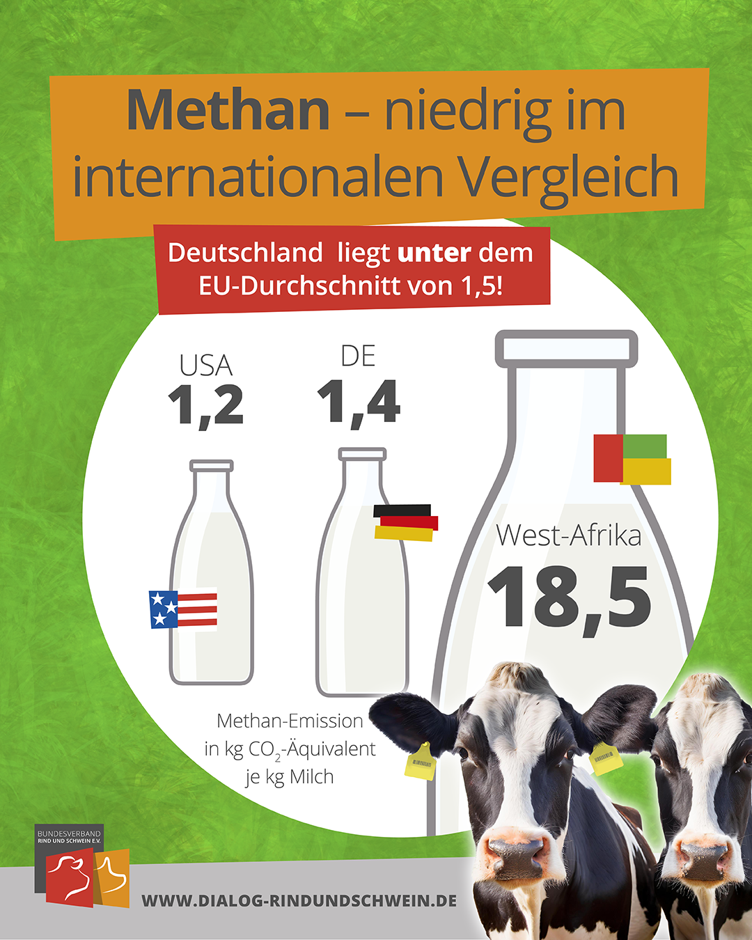 Eine klimaneutrale Milcherzeugung ist vermutlich kaum zu erreichen, aber im internationalen Vergleich steht die deutsche Milchwirtschaft sehr gut da. Mit 1,4 kg CO2-Äquivalent (eq) je kg Milch liegen die Emissionen unter dem weltweiten Durchschnitt. Nur in den USA sind die Emissionen mit 1,2 kg CO2eq je kg Milch noch geringer. In Westafrika sind es 18,5 kg CO2eq. Dies macht deutlich, dass eine nachhaltige Intensivierung in der Milcherzeugung eine wichtige Stellschraube für den Klimaschutz darstellt.