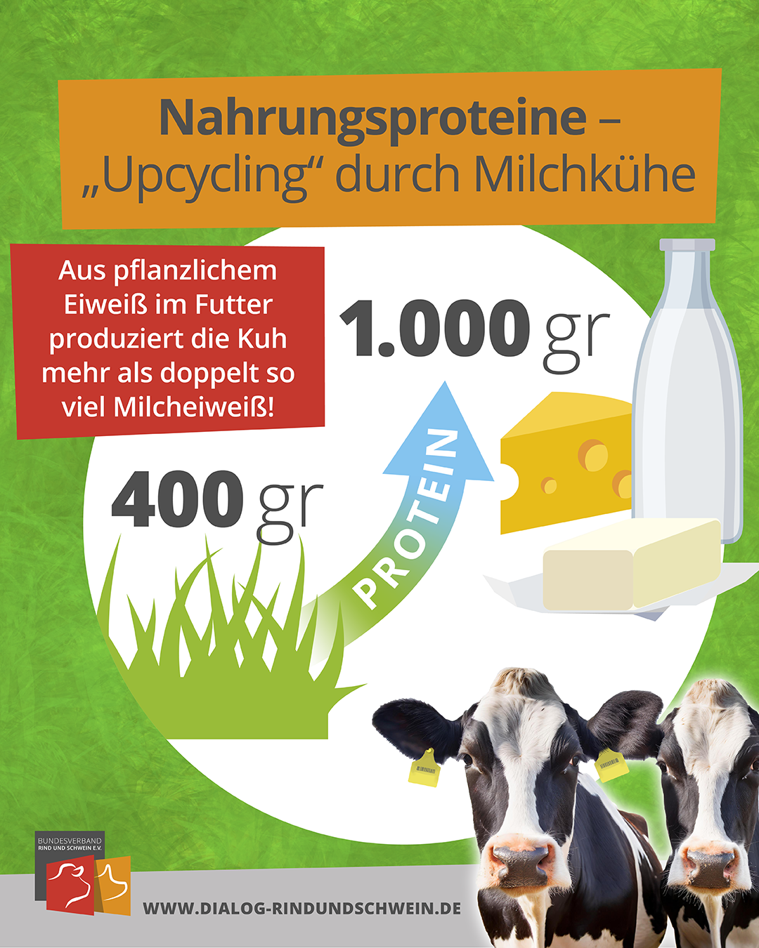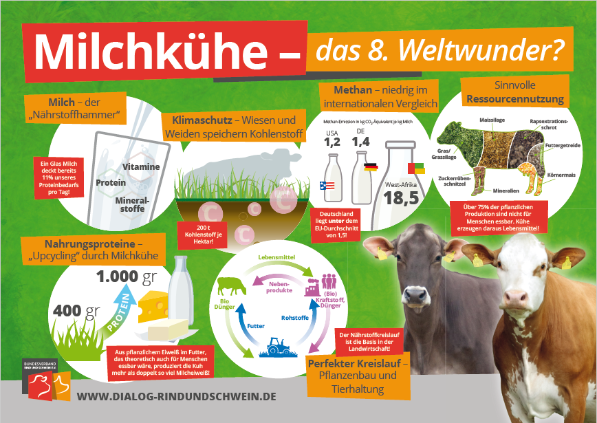 Kuhmilch ist in vielen Ländern ein wichtiger Lieferant von Eiweißen, Vitaminen und Mineralstoffen. Ein Glas Milch (200 ml) deckt bereits 11 Prozent des täglichen Eiweißbedarfs. Darüber hinaus erbringen Milchkühe weitere wichtige Leistungen. Wiederkäuer sind natürliche Bioreaktoren, die für den Menschen ungenießbares Pflanzenmaterial in hochwertige Nahrungsmittel umwandeln. Selbst aus dem Eiweißanteil einer durchschnittlichen Futterration, der theoretisch auch für den Menschen nutzbar wäre, erzeugt die Milchkuh mehr als doppelt so viel hochwertiges Milcheiweiß, das dem pflanzlichen Ausgangsmaterial qualitativ überlegen ist.