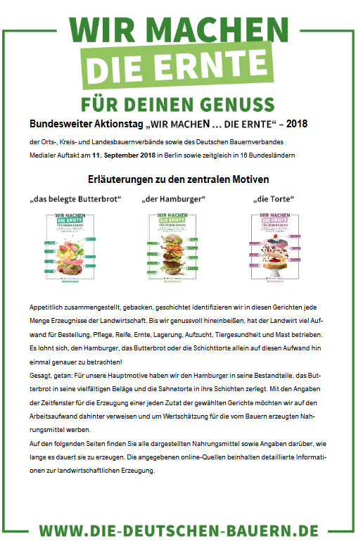 – 2018 der Orts-, Kreis- und Landesbauernverbände sowie des Deutschen Bauernverbandes Medialer Auftakt am 11. September 2018 in Berlin sowie zeitgleich in 16 Bundesländern. Die Aktion 2018 platziert das Thema Ernte