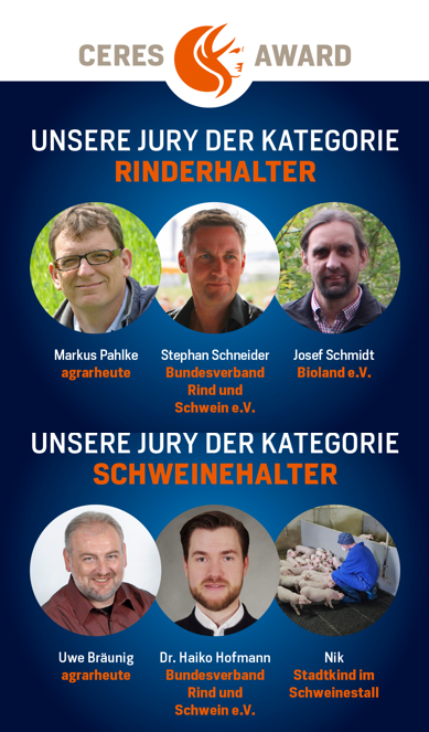 Auch in diesem Jahr lädt der Deutsche Landwirtschaftsverlag zum Ceres-Award ein, mit dem u.a. innovative Unternehmen aus der Rinder- und Schweinehaltung gewürdigt werden. In der Jury gab es Veränderungen. Neu in der Schweinejury dabei sind Dr. Haiko Hofmann, Referent Fachbereich Management Schwein beim BRS (Bundesverband Rind und Schwein e.V.) und Nik von Stadtkind im Schweinestall. Neu in der Rinderjury dabei sind Stephan Schneider, stellv. Geschäftsführer/ Fachbereichsleiter BRS (Bundesverband Rind und Schwein e.V.) sowie Josef Schmidt, Vorstandsmitglied Bioland.