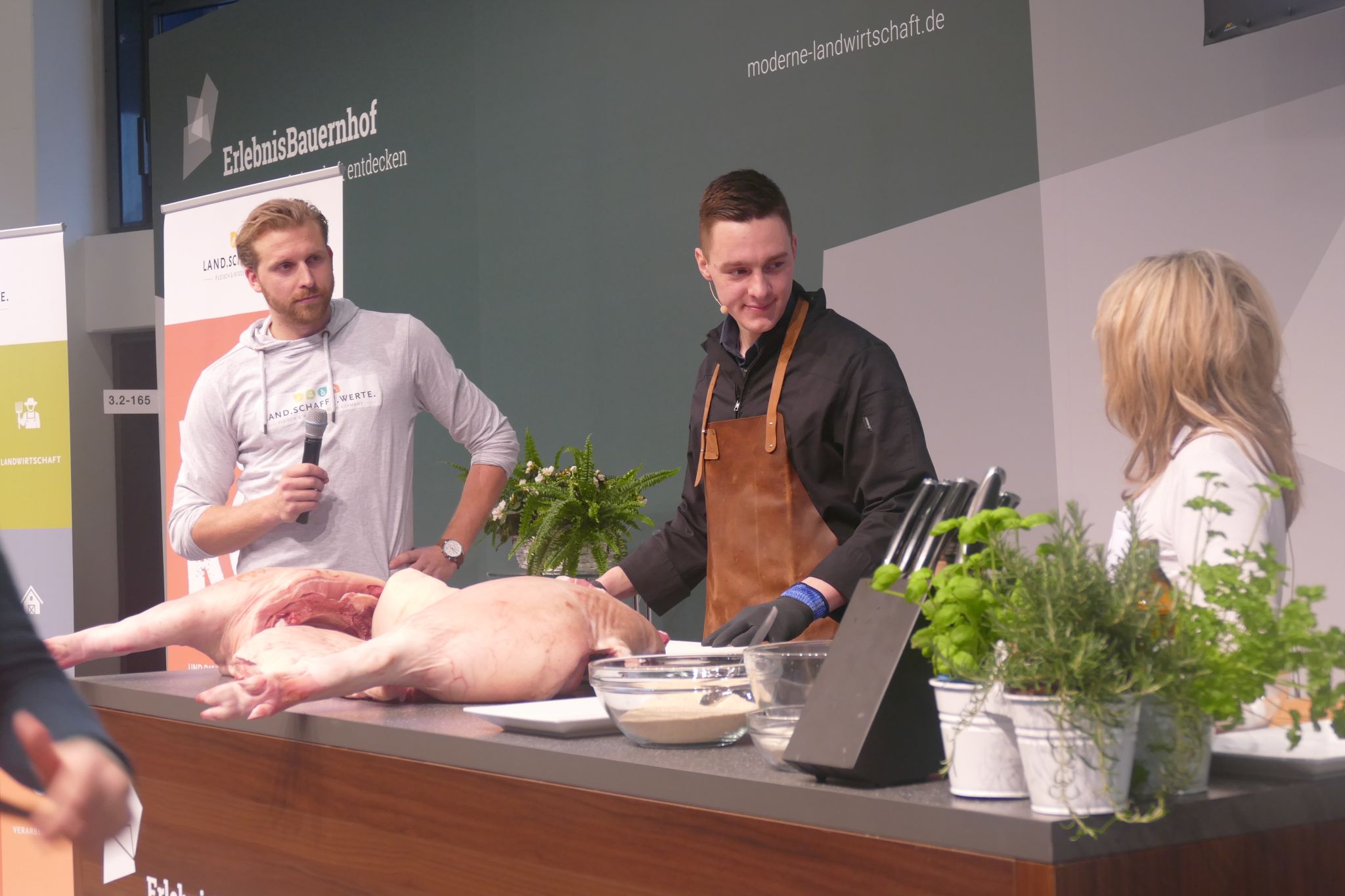 Am 22. und 23. Januar 2020 in der Halle des Erlebnisbauernhofes dreht sich alles um das wertvolle Lebensmittel Fleisch. Wie wird eine Bratwurst hergestellt? Woraus besteht sie? Wo kommt das Fleisch eigentlich her? Das Team von LAND.SCHAFFT.WERTE. und Metzgermeister Max zeigen es den interessierten Besuchern des Erlebnisbauernhofes hautnah. In dem dreimal 30-minütigen Bühnenprogramm zeigt Max Beck der Öffentlichkeit, welches Handwerk hinter der Zerlegung einer Schweinhälfte steckt. Unverhüllt und unverfälscht zeigt Max mit den LSWlern was es heißt, aus einer Schweinehälfte eine Grillbratwurst herzustellen. Wertschätzung für das Lebensmittel Fleisch soll die interaktive Bühnenschau erreichen. Fragen und Probieren ist ausdrücklich erwünscht! Eine Köchin bereitet direkt vor Ort die Bratwurstvariationen zu und es darf ordentlich geschlemmt werden.
