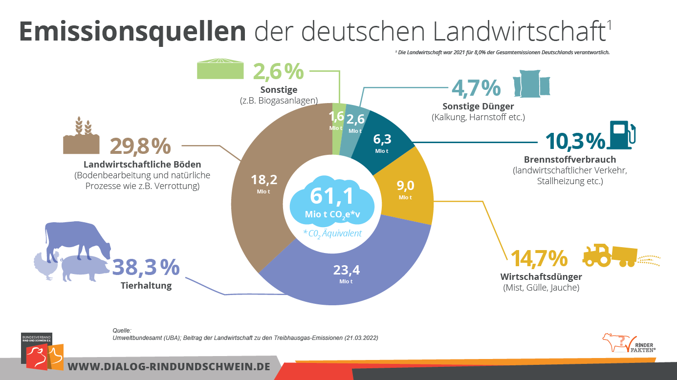Die Tierhaltung steht als Umweltverschmutzer und Klimaschädling in der Kritik. Völlig zu Unrecht. Seit Jahren beträgt der Anteil der dt. Tierhaltung an den deutschen Gesamtemissionen rd. 4 Prozent. Die ldw. Emissionen summieren sich auf 8 bis 9 %. Was überhaupt nicht berücksichtigt wird, sind die C02-Einsparungen, die bei der Vergärung von Wirtschaftsdung (Gülle) oder den Ersatz von energieintensiven Mineraldüngern positiv zu Buche schlagen.
