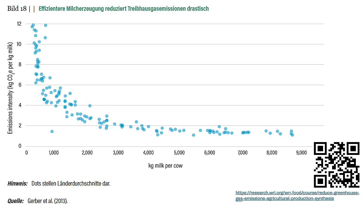 Das World Resource Insitut hat die Treihausgasemissionen aus der Tierhaltung weltweit geschätzt. Aufgrund der steigenden Nachfrage nach tierischen Lebensmitteln v.a. in Schwellen- und Drittländern, werden die Emissionen weiter steigen. Die jährlichen Emissionen aus landwirtschaftlichen Produktionsprozessen (d. h. ohne Emissionen aus der Landnutzungsänderung) werden voraussichtlich 9 Gt im Jahr 2050 erreichen. Damit würde das Reduktionsziel deutlich verfehlt. Allerdings gibt es auch zahlreiche Reduzierungsmaßnahmen, die noch nicht ansatzweise ausgeschöpft werden. Mit jeder Effizienzsteigerung sinken auch die Emissionen.