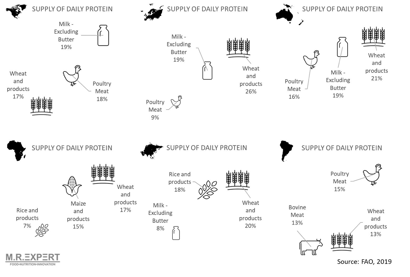 Dank einer leistungsfähigen regionalen Landwirtschaft haben wir für Weizen und Milch in Deutschland einen ausreichenden Selbstversorgungsgrad. Angesichts einer weltweiten Nahrungsmittelkrise, zeigt die Grafik des Ernährungswissenschaftlers Dr. Malte Rubach welche Nahrungsmittel pro Kontinent die TOP3 der Proteinversorgung sind.