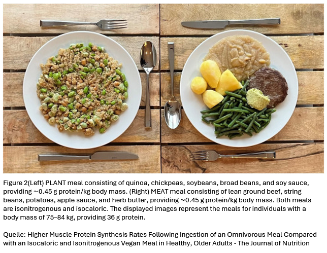 Der Eiweissverzehr kann sich positiv auf Muskelaufbau und -erhalt auswirken. Entscheidend hierfür ist die Eiweissqualität, also seine Aminosäurezusammensetzung und Verfügbarkeit und letztlich auch seine Verdaulichkeit. Tierische Proteine sind pflanzlichen hinsichtlich Zusammensetzung und verdaulichkeit häufig überlegen. Aber: erst eine Mischkost macht tierische und pflanzliche Proteine zu einem Winning-Team. Das zeigt eine neue Studie, bei der die Auswirkungen einer Vollwertkost mit Rindfleisch und die einer Vollwertkost mit ausschließlich pflanzlichen Proteinquellen auf die Muskelsyntheserate untersucht wurde. Allerdings wählte das Forschungsteam eine ältere Versuchsgruppe, bei denen die Muskelmasse mit zunehmenden Alter abnimmt.