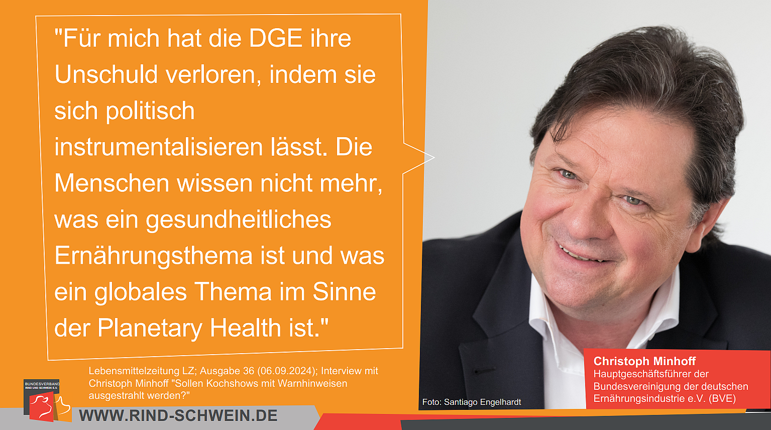 Aus Sicht des Hauptgeschäftsführers der Bundesvereinigung der Deutschen Ernährungsindustrie (BVE), Christoph Minhoff, lässt sich die DGE damit politisch instrumentalisieren und verunsichert die Verbraucherinnen und Verbraucher. Die Menschen wissen nicht mehr, was ein gesundheitsrelevantes Ernährungsthema und was ein globales Thema im Sinne einer