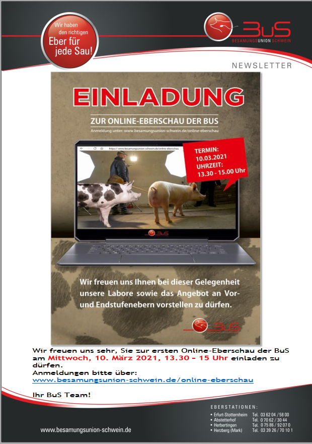 Die Besamungsunion Schwein (BuS) lädt zu ihrer ersten virtuellen Eberschau am 10. März (von 13:30 - 15:00 Uhr) ein. Vorgestellt wird ein Angebot an Vor- und Enstufenebern. Zusätzlich wird eine virtuelle Führung durch die Labore angeboten. Eine Teilnahme ist nur nach Voranmeldung möglich.