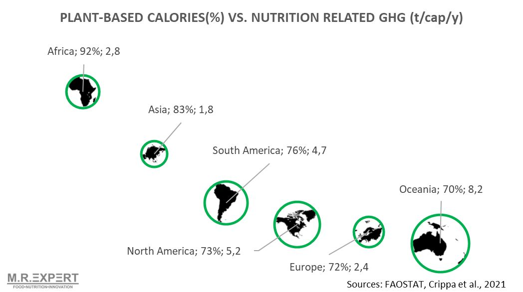Das stimmt so nicht ganz, stellt der Ernährungswissenschaftler Dr. Malte Rubach fest. Wenn man abgleicht, wie hoch die ernährungsbedingten GHG-Emissionen auf den unterschiedlichen Kontinenten ausfallen und welchen Anteil pflanzliche Kalorien in der Ernährung ausmachen, ergäbe sich ein etwas komlexeres Bild. Ein hoher plant-based Anteil bedeute nicht automatisch weniger Treibhausgase durch Ernährung, informiert der Wissenschaftler. Es komme auf die Effizienz des landwirtschaftlichen Produktionssystems an und auf die Verzehrmengen, z. B. viel Fleisch und extensive Rinderhaltung in Australien vs. insgesamt weniger Verzehrmengen und intensivere Tierhaltung in Asien. Sein Fazit: Für komplexe Probleme gibt es meistens keine einfachen Lösungen!