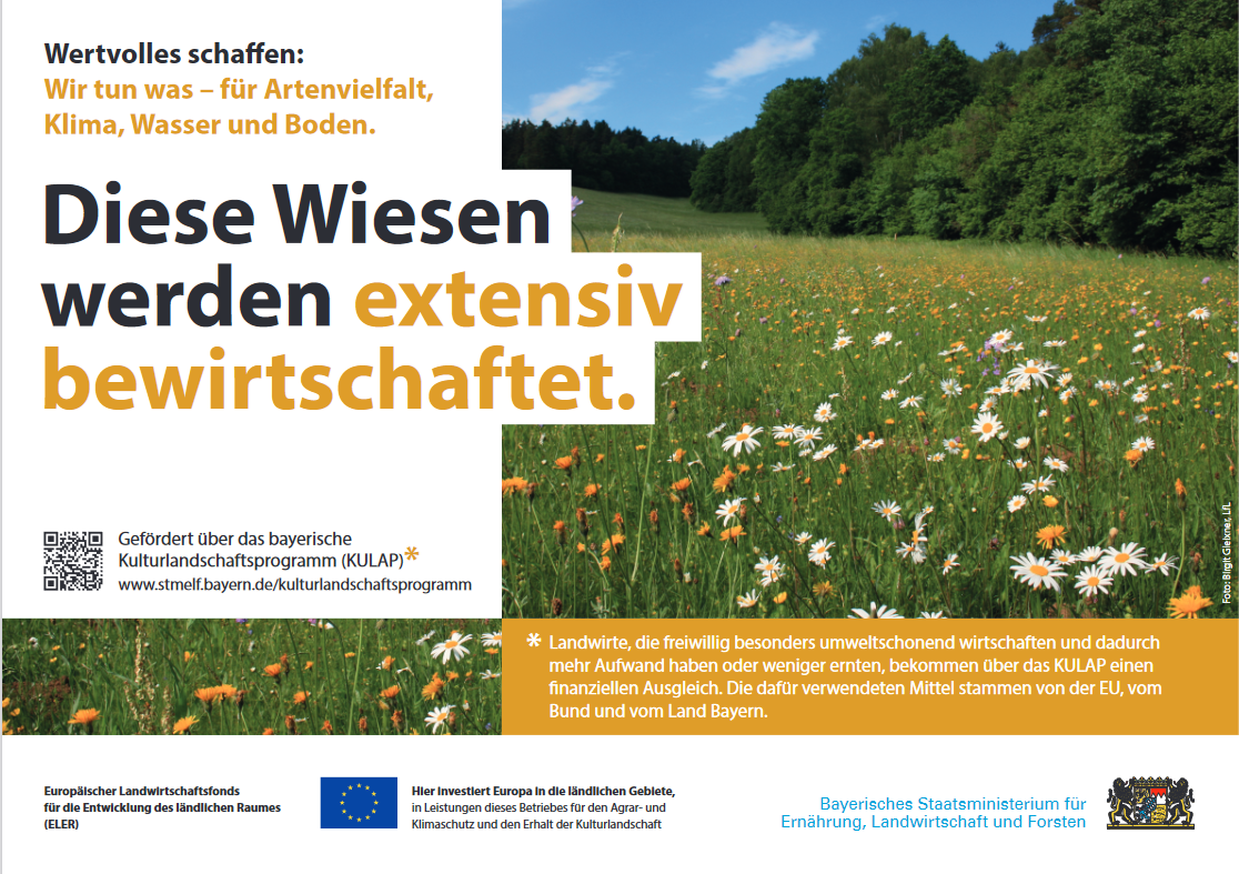 Damit die vielfältigen Leistungen der Landwirtschaft für die breite Gesellschaft in Bayern sichtbar werden, stellt die Landwirtschaftsverwaltung Feldtafeln zum Kulturlandschaftsprogramm zur Verfügung, mit denen Landwirte ihre KULAP-Flächen kennzeichnen können. Die Kernbotschaften der Schilder sind: Landwirte tun etwas für Artenvielfalt, Boden, Wasser und Klima. Feldtafeln gibt es momentan zu den folgenden Maßnahmen: