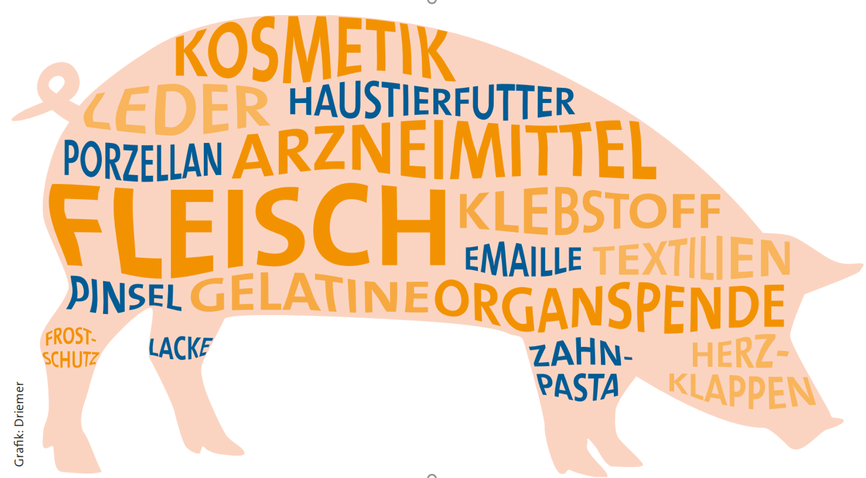 drin ist. Sie hat mehr als 150 Produkte gefunden. In der aktuellen Schweinezucht und Schweinemast finden Sie dazu diese Grafik. Im Internetportal www.dialog-rindundschwein.de findet sich eine ähnliche Grafik für Rinderhalter, die auch Thema für den Ernährungswissenschaftler Malte Rubach war. Er macht mit seiner Grafik greift mit seiner Grafik das Thema der Künsterin auf und macht darauf aufmerksam, dass Fleichersatz nicht nur Fleisch, sondern die vielen Koppelprodukte ersetzen muss.