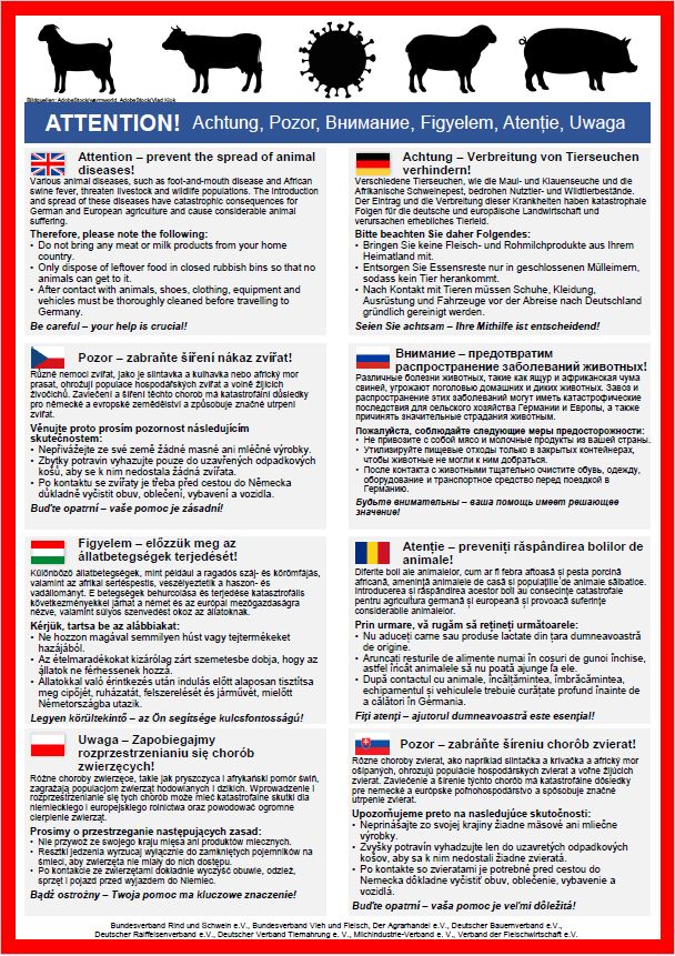 Aktuell scheinen sich Informationen zu verdichten, dass der Eintrag der Maul- und Klauenseuche in Brandenburg auf illegal eingeführte Lebensmittel zurückzuführen ist. Daher haben acht führende Verbände der Agrarbranche gemeinsam einen Flyer erstellt, der sich an Saisonarbeitskräfte und andere Personen richtet, die in Deutschland auf landwirtschaftlichen Betrieben arbeiten. Der Flyer verweist auf die notwendige Hygiene und den sorgsamen Umgang mit Lebensmitteln tierischer Herkunft, um die Einschleppung von Tierseuchen wie MKS oder ASP zu vermeiden. Die Maßnahmen betreffen auch Personen, die in reinen Pflanzenbaubetrieben arbeiten. Achtlos entsorgte kontaminierte Lebensmittel können für Wildtiere zugänglich sein und so für einen Ausbruch sorgen. Nutzen und verbreiten Sie den Flyer zur Verbreitung der Botschaften, besonders wenn Sie mit Personal planen, das aus Regionen stammt, in dem gefährliche Tierseuchen vorkommen.
