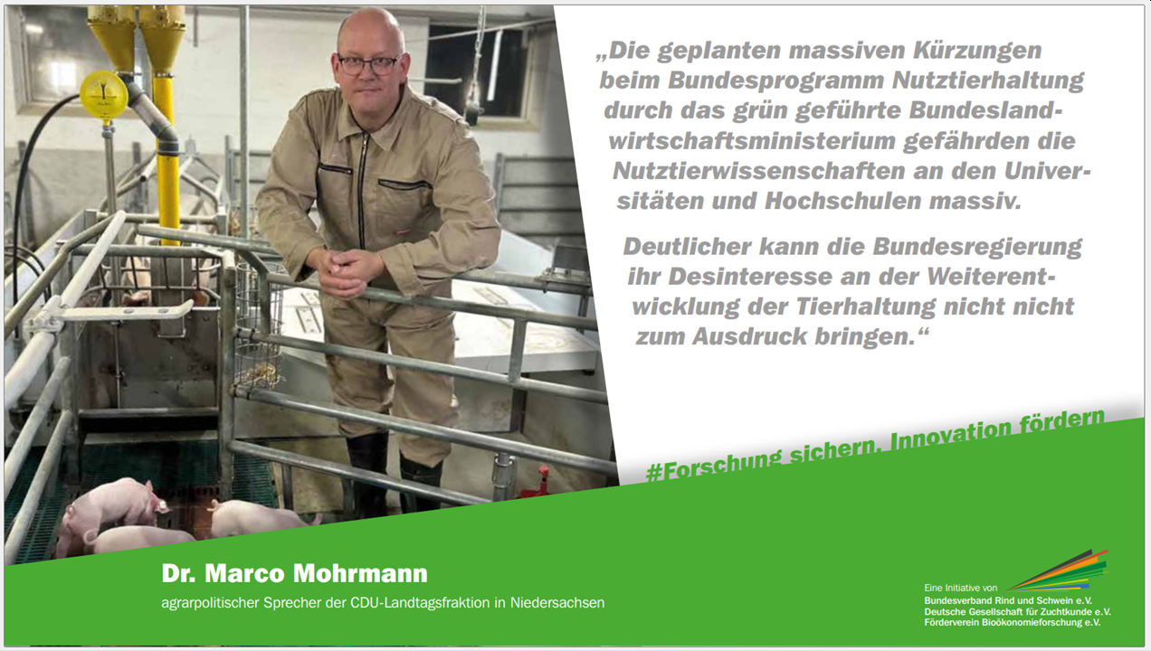 Das Bundeslandwirtschaftsministerium hat angekündigt, dass die Mittel für das Bundesprogramm Nutztierhaltung bereits im Jahr 2023 gekürzt und eine Förderung ab 2027 in Abhängigkeit der Haushaltslage vorgesehen ist. Zwar könnten damit laufende Maßnahmen fortgesetzt, aber keine neuen im bisherigen Umfang angestoßen werden. Die Agrarfakultäten haben Angst, dass die Weiterentwicklung der Tierhaltung ins Stocken gerät. Politisch ist sie das bereits aufgrund fehlender langfristiger Finanzierungszusagen und fehlende Marktanreize. Der BRS, der FBF und die DGfZ werben daher mit der Kampagene #Forschung sichern, Innovation fördern