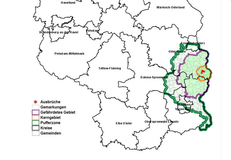 In Brandenburg sind bei mittlerweile 20 Wildschweinen wenige Kilometer von der deutsch-polnischen Grenze entfernt in den Landkreisen Spree-Neiße und Oder-Spree die Afrikanische Schweinepest (kurz: ASP) festgestellt worden. Der erste Ausbruch der Afrikanischen Schweinepest beim Schwarzwild in Deutschland ist amtlich vom Landkreis Spree-Neiße am 10. September 2020 festgestellt worden. Für den Menschen und für andere Haus- und Nutztierarten als Schweine ist die Afrikanische Schweinepest ungefährlich. Die Maßnahmen zum Schutz vor einer Ausbreitung der Afrikanischen Schweinepest laufen im Land Brandenburg auf Hochtouren. Oberstes Ziel ist es, die Tierseuche auf ein möglichst kleines Gebiet einzudämmen und zu verhindern, dass diese sich ausbreiten kann. Um die Fundorte wurden sogenannte Restriktionszonen eingerichtet, in denen verschiedene Maßnahmen umgesetzt werden. Die betroffenen Landkreis beantworten wiederkehrende Fragen auf ihrer Internetseite als FAQ und haben dort auch ihre Tierseuchen-Allgemeinverfügungen veröffentlicht.