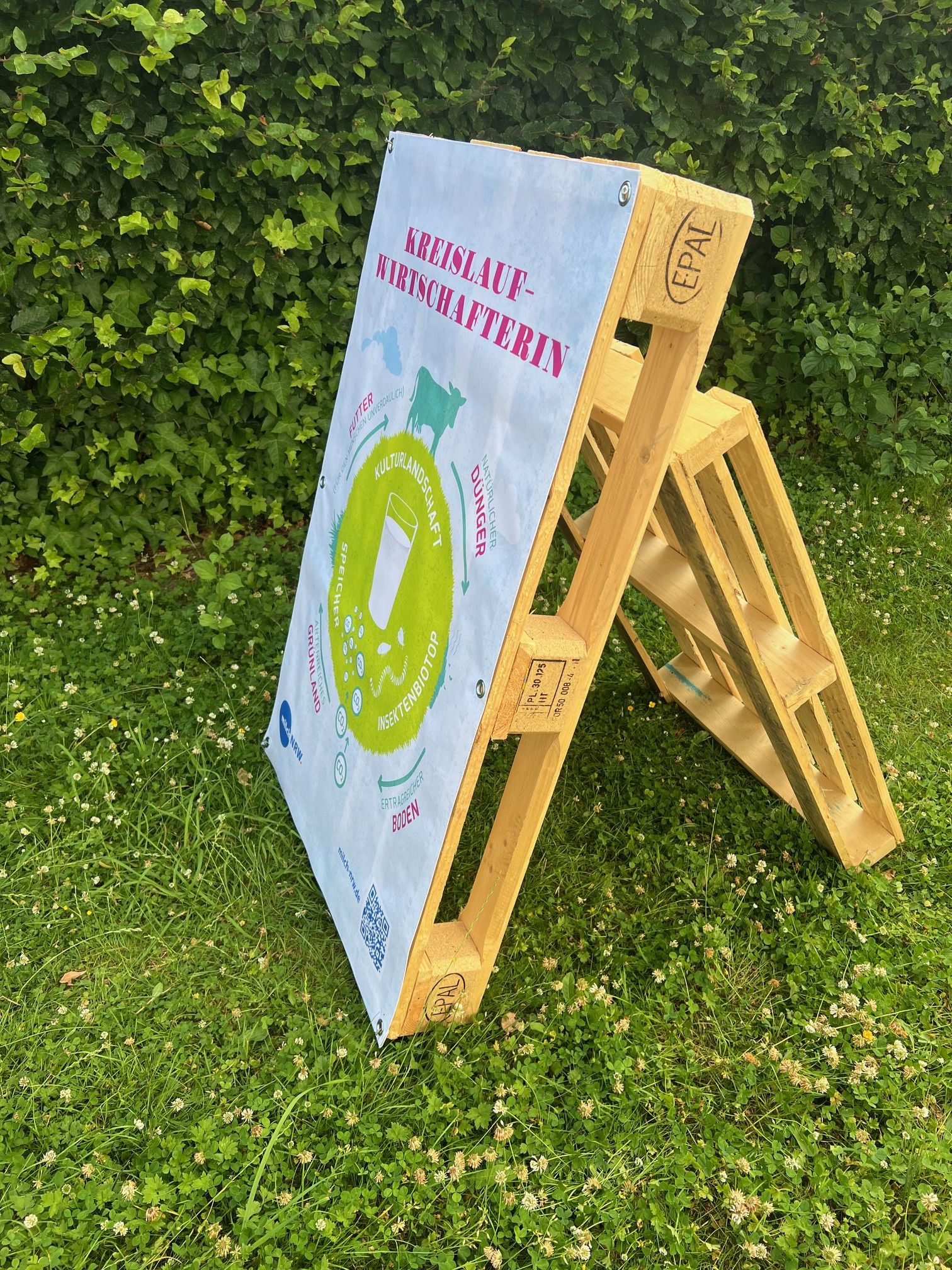 als Hofbanner im Format einer Europalette (120 x 80 cm) kostenfrei an. Die wetterfesten PVC-Banner können auf einer Europalette angeschraubt und an passenden Stellen platziert werden. Über einen QR-Code auf dem Hofbanner kommen die Nutzer auf weitere Informationen zum Thema und zum neu produzierten Video Die Kreislaufwirtschafterin