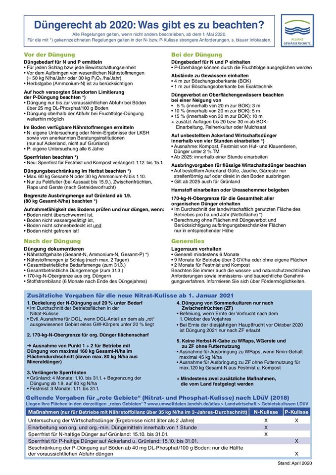 Der Bundesrat hat am 27.03.2020 den Änderungen der Düngeverordnung (DüV) zugestimmt. Vor diesem Hintergrund ist davon auszugehen, dass die Novelle der DüV im April bzw. Anfang Mai 2020 in Kraft treten wird. Die jeweiligen Maßnahmen in den nitrat- und phosphatsensiblen Gebieten, wie beispielsweise die Reduzierung des N-Düngebedarfs um 20 % werden entgegen den allgemeinen flächenbezogenen Maßnahmen erst am 01.01.2021 in Kraft treten. Mit der neuen Düngeverordnung gelten ab April bzw. Mai 2020 neben den bereits geltenden Regelungen der DüV die nachfolgend näher dargestellten Vorgaben.