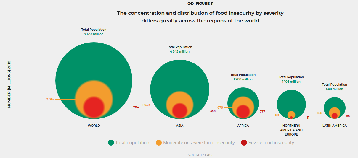 Jeder vierte Mensch erhält keine ausreichende und qualitativ gute Nahrung. Die Welternährungsorganisation FAO schätzt, dass die Zahl der Menschen, die unter Hunger und mittlerer oder schwerer Ernährungsunsicherheit