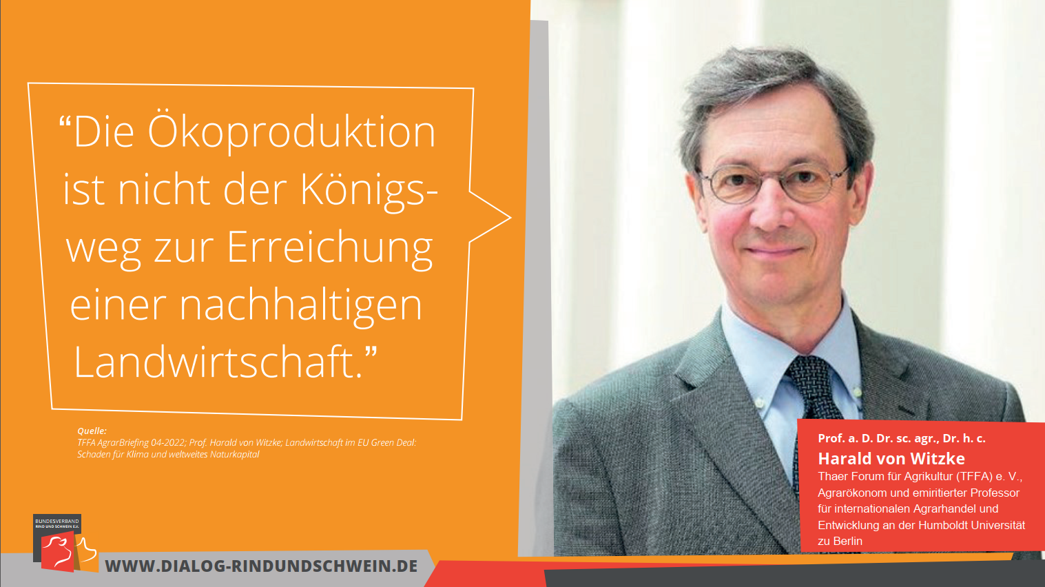 So wichtig der Klimaschutz auch ist, die vorgeschlagenen Maßnahmen könnten global betrachtet genau das Gegenteil von dem bewirken, was die EU eigentlich erreichen will. Darauf weist der Agrarökonom Prof. Dr. Harald von Witzke vom Thaer Forum für Agrikultur (TFFA) e. V. und emeritierter Professor für internationalen Agrarhandel und Entwicklung an der Humboldt-Universität zu Berlin hin. Experten kritisieren die Fokussierung des Green Deal auf die Auswirkungen innerhalb der EU. Der Ökolandbau weist ein deutlich geringeres Ertragsniveau als der konventionelle Landbau auf. Dies führt weltweit zu einer zusätzlichen Ausdehnung der landwirtschaftlichen Nutzflächen. Dadurch werden global per Saldo weit mehr Klimagase emittiert als in der EU eingespart, weiterhin wird Biodiversität zerstört.