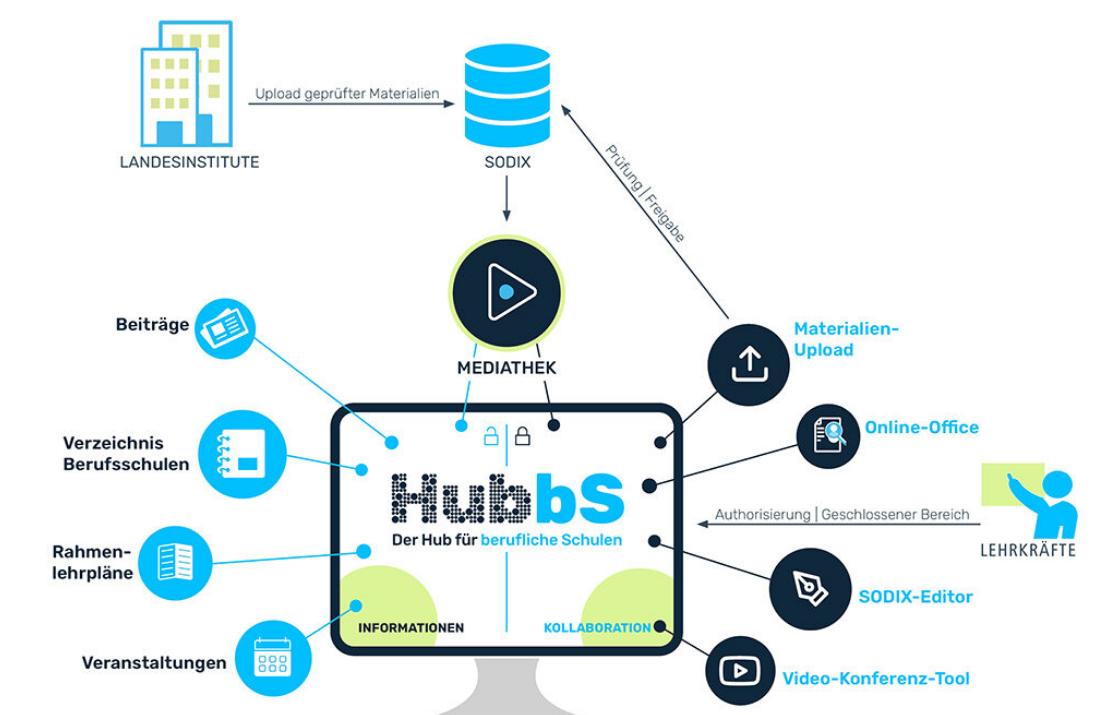 Mit HubbS, stellen die 16 Bundesländer ein umfassendes, frei zugängliches Medienangebot für Lehrkräfte beruflicher Schulen zur Verfügung. Zentraler Baustein der Bildungsmedieninfrastruktur ist ein ausschließlich Lehrkräften vorbehaltener, anmeldepflichtiger Bereich, der verschiedene Möglichkeiten der Vernetzung und Interaktion bietet. Eine erste Version des Webportals ist online.