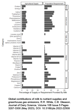 Weltweit unterscheiden sich Wiederkäuer-Produktionssysteme, die zur Synthese von Fleisch und Milch verwendet werden, enorm in Bezug auf ihre Effizienz, Produktivität und Umweltauswirkungen. Ungeachtet dieser Variabilität wurde Milch immer wieder als essentielle Nährstoffquelle für den Menschen identifiziert. Flüssige Milch liefert über 10 % der verzehrbaren Vorräte an Vitamin B12, Vitamin A, Riboflavin und Kalzium, die für Menschen weltweit verfügbar sind. In Bezug auf den menschlichen Nährstoffbedarf liefert Milch ausreichend Vitamin B12, um den Bedarf von über 60 % der Weltbevölkerung zu decken, Riboflavin, um den Bedarf von 50 % der Bevölkerung zu decken, und Calcium und Phosphor für über 35 % der Bevölkerung. Im Vergleich zu anderen Lebensmitteln rangierte Milch in Bezug auf das Nährstoff-Kalorien-Verhältnis für zahlreiche Aminosäuren, Phosphor, Kalzium und Riboflavin unter den besten Nährstoffquellen. Bedingte Abhängigkeiten wurden zwischen Treibhausgasemissionen und Wiederkäuermilch und -fleisch identifiziert, nicht jedoch zwischen Wasserentnahme und Milchproduktion. Ziel muss es sein, die Umweltauswirkungen der Milchproduktion zu reduzieren, um den Nutzen von Milch für die Ernährung der wachsenden Weltbevölkerung zu verbessern. Deutschland kann hierfür ein gutes Beispiel sein.