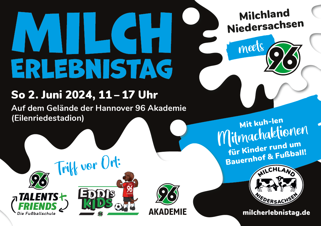 Am Sonntag, den 02.06.2024, feiert die Landesvereinigung der Milchwirtschaft Niedersachsen e.V. (LVN) zusammen mit der 96-Akademie, der 96-Fußballschule und dem Kinderclub EDDIs KIDS den Internationalen Tag der Milch. Auf dem Akademiegelände vor dem Eilenriede-Stadion in der Clausewitzstraße in Hannover findet von 11:00−17:00 Uhr ein vielfältiges Familienfest statt, das nicht nur junge Milch- und Fußballfans begeistert.