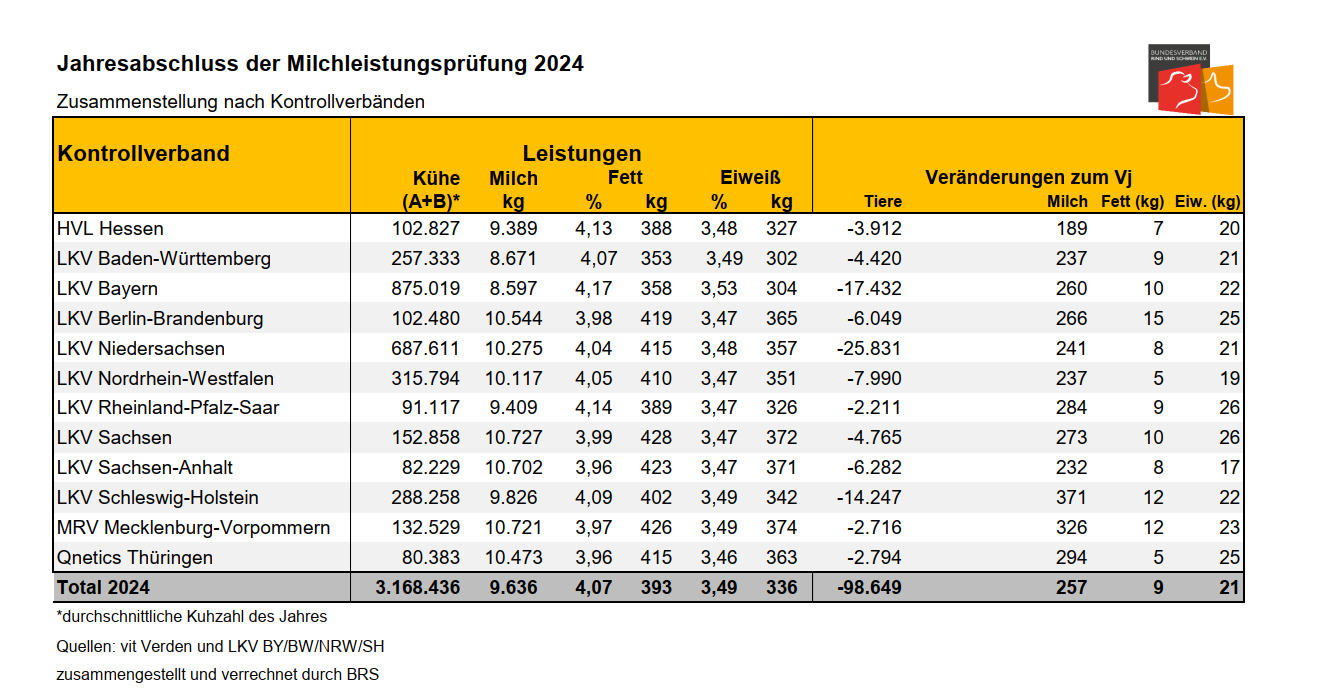 Auch in diesem Jahr konnte die Milchleistung im Vergleich zum Vorjahr weiter gesteigert werden. Die durchschnittliche Jahresleistung lag bei 9.636 kg Milch mit einem Milchfettanteil von 4,07 % und einem Milcheiweißgehalt von 3,48 %. Die 3,17 Millionen in Deutschland geprüften Milchkühe gaben im Durchschnitt aller Rassen 257 kg mehr Milch als im Vorjahr. Die höchste Leistungssteigerung erzielten die Kühe aus Schleswig-Holstein (+ 371 kg), gefolgt von den Kühen aus Mecklenburg-Vorpommern (+ 326 kg). Die höchste mittlere Milchleistung je Kuh wurde dieses Jahr in Sachsen erreicht (10.727 kg bei 3,99 % Fett und 3,47 % Eiweiß). Das mittlere Leistungsniveau der Kühe in Bayern lag dagegen bei 8.597 kg Milch mit den im Bundesdurchschnitt höchsten Fett- und Eiweißgehalt von 4,17 % und 3,53 %. Die regional teilweise sehr unterschiedlichen Leistungen sind hauptsächlich auf die verschiedenen Produktionsvoraussetzungen und die vorherrschenden rassespezifischen Zuchtphilosophien zurückzuführen.