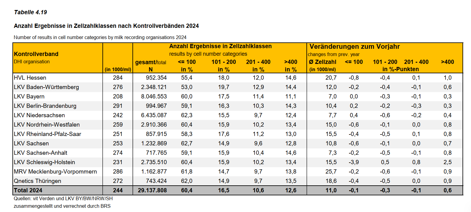 In Deutschland wird die Gesundheit der Milchkühe engmaschig überwacht. Ein wichtiges Instrument ist dabei die unabhängige monatliche Milchkontrolle. Für das Milchkontrolljahr 2024 (01.10.2023 bis 30.09.2024) hat der Bundesverband Rind und Schwein e.V. (BRS) die Milchkontrollergebnisse aus allen Regionen Deutschlands zusammengefasst. Die Zahlen zeigen, dass die Milchviehhalter erneut ihr Können bewiesen und eine vergleichbar gute Eutergesundheit wie im Vorjahr erreicht haben.