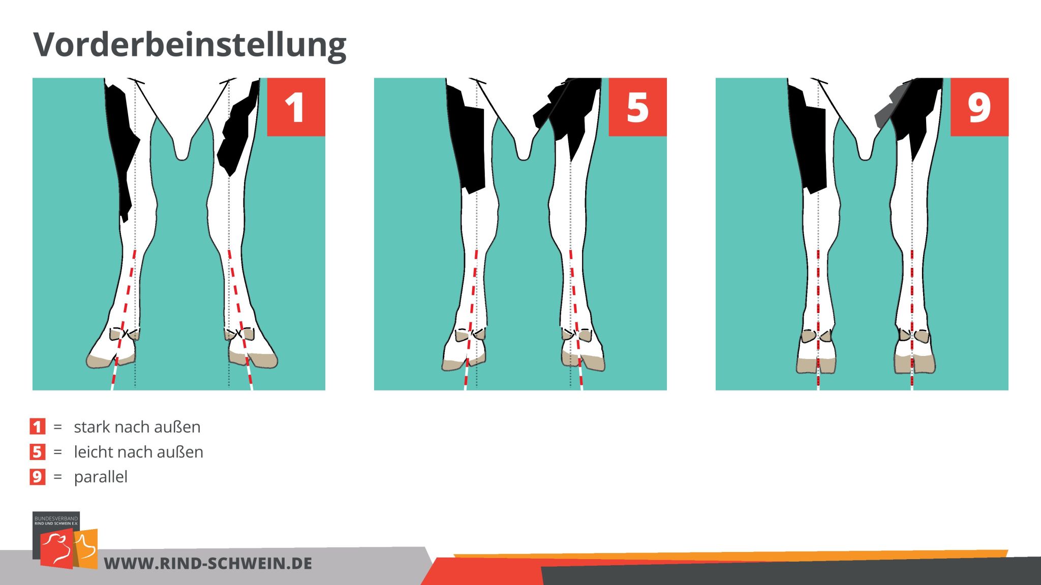 Das dritte neue Exterieurmerkmal beschreibt analog zur Hinterbeinstellung die Ausrichtung der vorderen Klauen und Beine und ist, wie auch Euterbalance, bereits seit Jahren bei extremer Ausprägung ein erfasster Mangel. Angestrebt werden idealerweise parallel gestellte Klauen. Nach außen orientierte Klauen werden seit geraumer Zeit vermehrt auf den Betrieben beobachtet. Genetisch ist das neue Merkmal nicht oder nur leicht mit anderen Fundamentmerkmalen korreliert. Die für ein Fundamentmerkmal gute Erblichkeit von 0,09 ermöglicht nun eine züchterische Bearbeitung der Vorderbeinstellung.