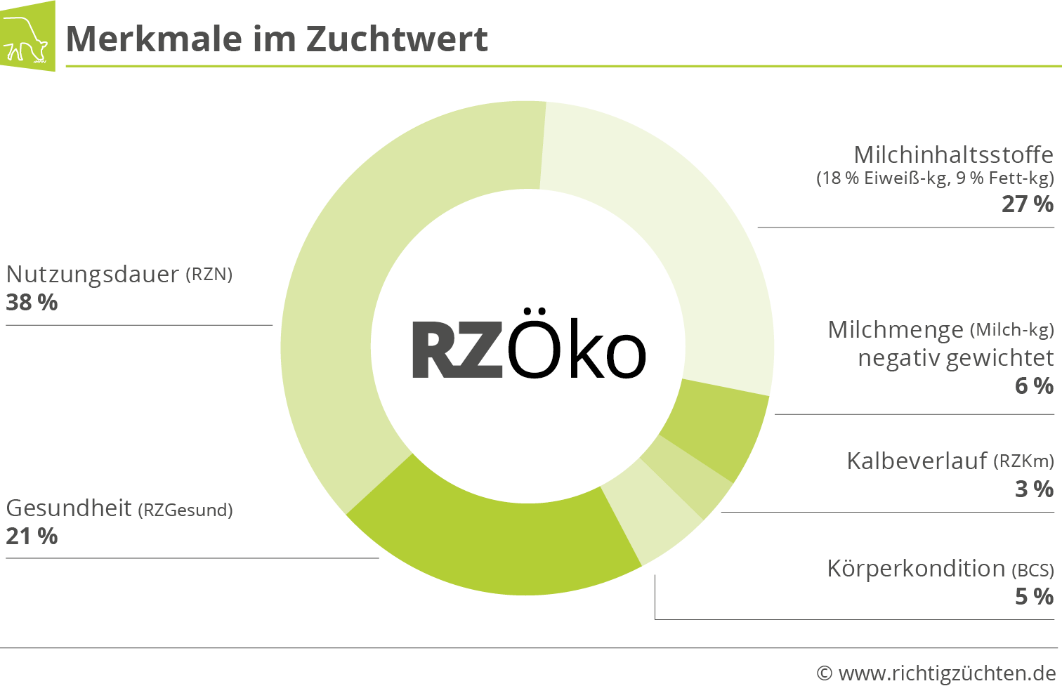 18 % Eiweiß-kg und 9 % Fett-kg eher unterdurchschnittlich stark für einen Gesamtzuchtwert vertreten. Hinzu kommt eine Negativgewichtung von 6 % für Milch-kg, die zu einer Reduktion der energiefreien Milchmenge führen soll. Ein viel größerer Fokus liegt im neuen Zuchtwert auf der Nutzungsdauer (38 %) und der Gesundheit (21 %). Beide Merkmale sind für eine nachhaltige Bewirtschaftungsweise essenziell. Unter ökologischen Bedingungen ist der Einsatz vieler Arzneimittel stark eingeschränkt oder mit doppelter Wartezeit verbunden. Der RZGesund ermöglicht dabei die Zucht auf eine gute Gesundheit und hilft, den Medikamenteneinsatz zu minimieren. Zusätzlich entfallen 5 % auf den Körperkonditionszuchtwert BCS, der ein Abmagern zu Laktationsbeginn vermeiden soll. Für problemlose Kalbungen fließt der RZKm mit 3 % in den RZÖko ein. Die Kombination der Merkmale im Index führt auch zu eher mittelrahmigen Kühen.
