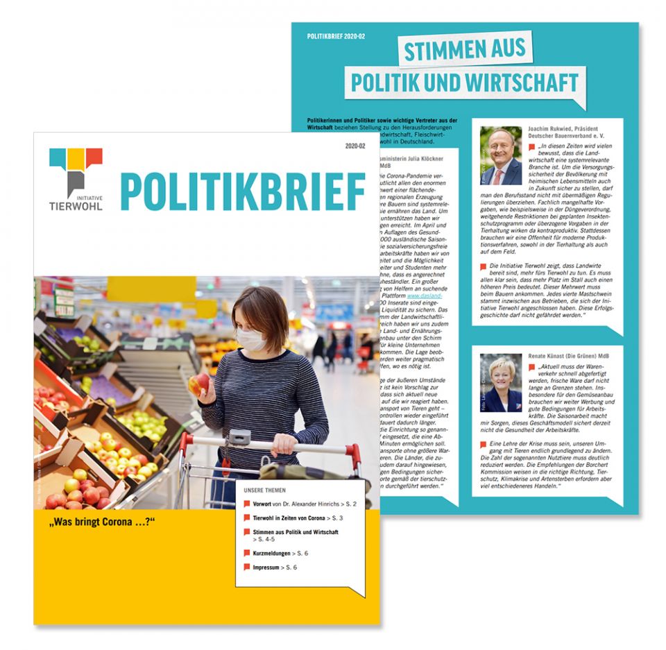 Zu diesen und weiteren Fragen und den mit der Corona-Pandemie für Landwirtschaft, Fleischwirtschaft und Handel einhergehenden Herausforderungen, äußern sich in der neuen Ausgabe des Politikbriefs der Initiative Tierwohl u. a. Landwirtschaftsministerin Julia Klöckner (CDU), Joachim Rukwied (Präsident des Deutschen Bauernverbandes), Friedrich Otto Ripke (Präsident Zentralverband der Deutschen Geflügelwirtschaft) und Renate Künast (Die Grünen). Zusätzlich wird der Frage nachgegangen, , was die aktuelle Situation für das Tierwohl im Allgemeinen und für die ITW im Besonderen bedeutet.