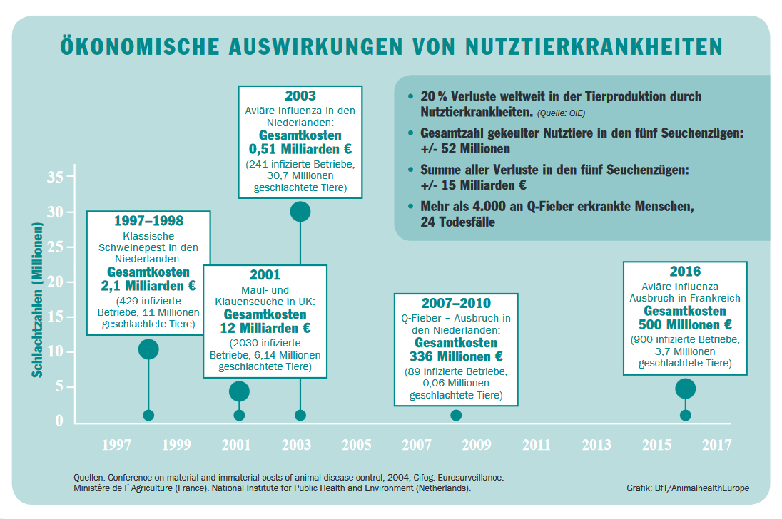 (87, Juni 2018) eine Grafik mit den Auswirkungen von Nutztierkrankheiten von 1997 bis 2017 veröffentlicht und skizziert vor diesem Hintergrund die wachsende Bedeutung vorbeugender Tiergesundheitsstrategien, zu denen Impfungen mittlerweile ein Drittel des Arzneimittelmarktes ausmachen.