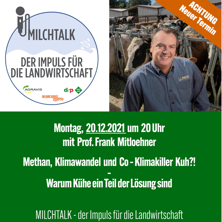 , die die AGRAVIS Raiffeisen AG gemeinsam mit der Zoetis Deutschland GmbH und der dsp-Agrosoft GmbH initiiert hat, behandelt aktuelle Themen mit bekannten Expertinnen und Experten aus der Milchviehbranche. Leider konnte die Milchtalk-Veranstaltung mit Prof. Frank Mitloehner von der Universität UC Davis im US-amerikanischen Bundesstaat Kalifornien kurzfristig nicht wie geplant am 13. Dezember 2021 stattfinden und wurde daher verschoben. Der neue Termin ist am 20. Dezember um 20 Uhr. Prof. Mitloehner zeigt, welchen Einfluss Milchkühe auf den Klimawandel haben und welche Lösungsansätze es für tierhaltende Betriebe gibt. Um Anmeldung wird gebeten.