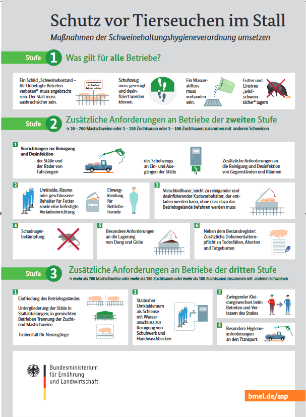 Das Bundesministerium für Ernährung und Landwirtschaft hat im Zusammenhang mit der ASP ein neues Stallplakat zum Download veröffentlicht. Das Plakat mit der Bezeichnung Schutz vor Tierseuchen im Stall – Maßnahmen der Schweinehaltungshygieneverordnung umsetzenkönnen Sie hier downloaden.