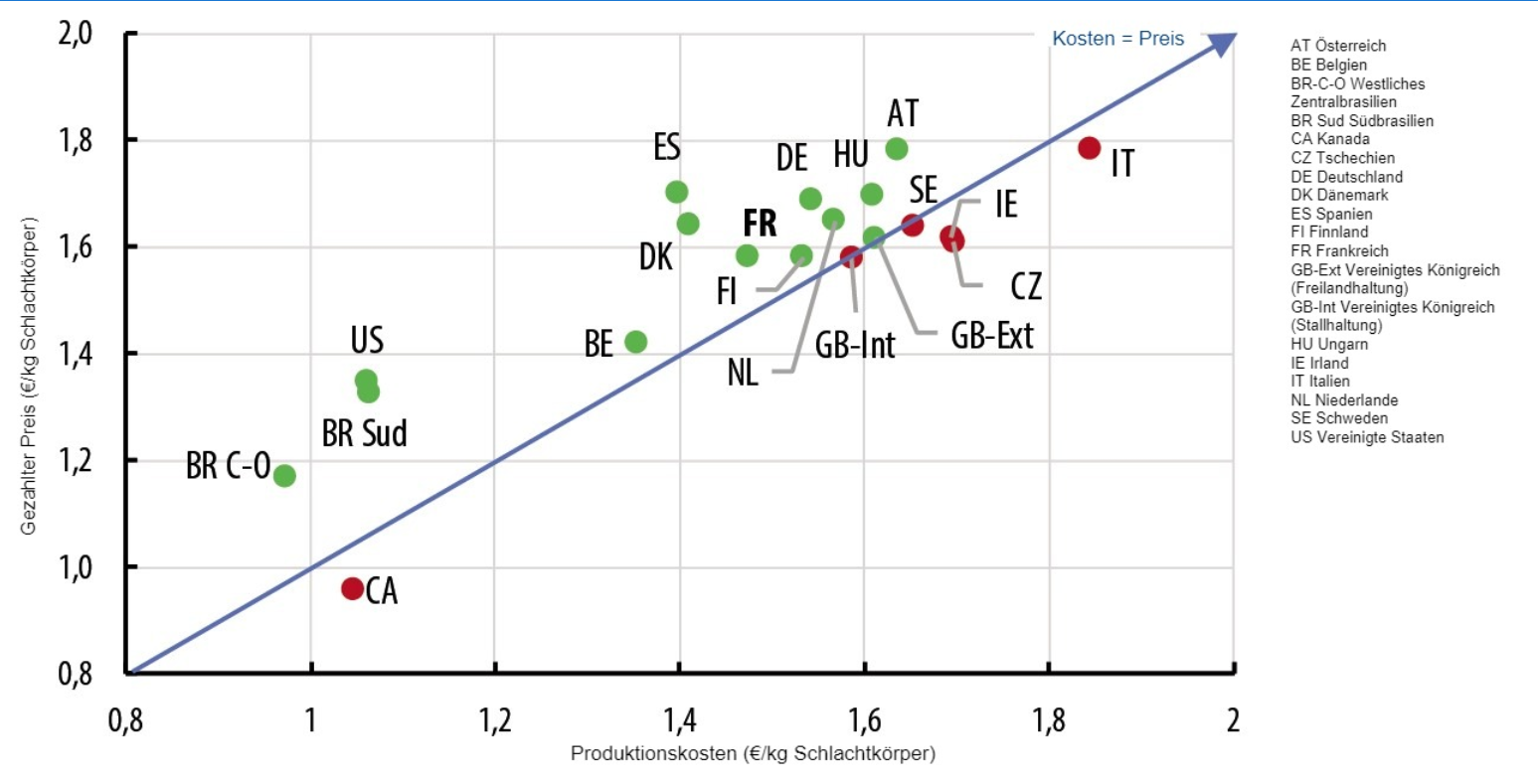 Die internationale Arbeitsgruppe InterPIG berechnet die unterschiedlichen Produktionskosten für die Schweineproduktion in 19 Ländern oder Regionen. Die Futterkosten variierten zwischen 0,66 €/kg Schlachtkörper in Zentralbrasilien und 1,18 €/kg Schlachtkörper in Italien. Futtermittel sind der bedeutendste Aufwandsposten, der in Finnland mindestens 48 % und in Südbrasilien bis zu 76 % der Produktionskosten ausmacht. Das Gewicht der anderen Posten hängt von den Kosten der Anlagen, den Kosten und der Produktivität der Arbeitskräfte und verschiedenen Betriebskosten (Ersatz von Tieren, Gesundheitskosten, Wasser und Energie usw.) ab. Die Variabilität der Arbeitskosten erklärt sich aus den großen Unterschieden zwischen den Ländern in Bezug auf die Arbeitskosten pro Stunde (von 3,2 €/Stunde bis 26,3 €/Stunde). Die Preisunterschiede für Neubauten sind ebenfalls beträchtlich: Sie reichen von 2,087 €/Sau in Brasilien bis zu 12,113 €/Sau in Finnland. Diese Schwankungen erklären die Unterschiede innerhalb der Position Abschreibungen und Finanzierungskosten