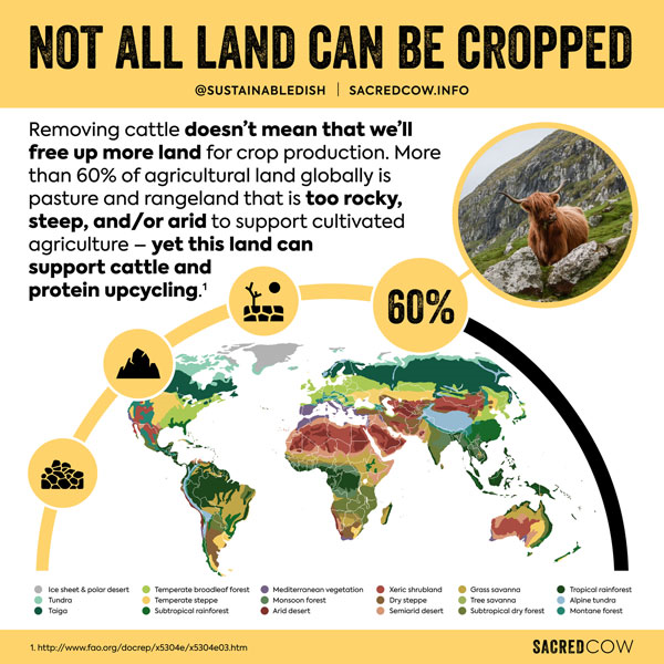 Nicht alle Flächen können bewirtschaftet werden. Die Abschaffung der Rinderhaltung bedeutet nicht, dass wir mehr Land für die Pflanzenproduktion freigeben. Mehr als 60 % der landwirtschaftlichen Nutzfläche weltweit sind Weideflächen, die zu felsig, steil und/oder trocken sind, um eine kultivierte Landwirtschaft zu unterstützen - doch diese Flächen dienen der Viehzucht und dem Protein-Upcycling.