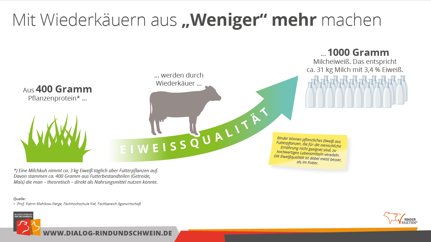 Der Rheinische Landwirtschafts-Verband (RLV) zeigt die Vorteile der Nutztierhaltung in der Ressourcenverwertung auf. Viele Grünlandflächen sind aufgrund ihrer Lage oder Bodenbeschaffenheit nur schwer oder gar nicht als Ackerland zu bewirtschaften. Für Natur- und Umweltschutz, aber auch als Ursprung hochwertiger Lebensmittel sind sie besonders wertvoll. Ohne eine Nutzung dieser Flächen würde das Grünland jedoch allmählich verbuschen und damit aus der Landschaft verschwinden. Rinder sind hier Teil der Lösung, so der RLV.