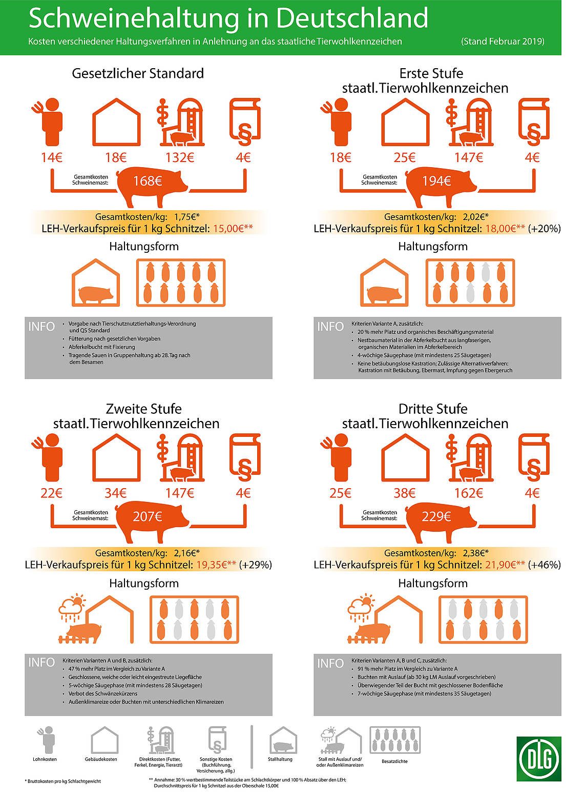 vergleicht anhand der wichtigsten Investitionsblöcke,welche Kosten für Landwirte pro Kilogramm Schweinefleisch in vier verschiedenen Haltungsverfahren entstehen. Zusätzlich bietet die Publikation eine Übersicht zur Struktur der deutschen Schweinehaltung sowie weitere relevante Informationen über den Weg des Schweines vom Stall bis zur Theke.