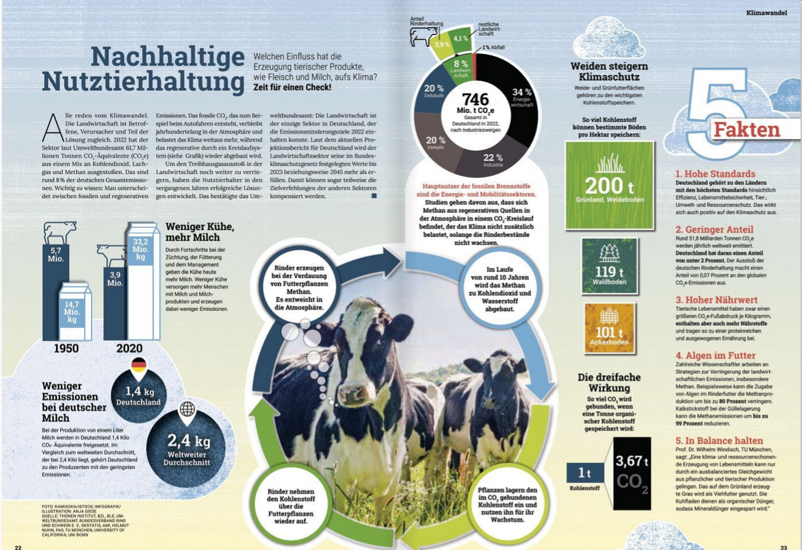 Welchen Einfluss hat die Erzeugung tierischer Produkte, wie Fleisch und Milch, aufs Klima? Zeit für einen Check! Alle reden vom Klimawandel. Die Landwirtschaft ist Betroffene, Verursacher und Teil der Lösung zugleich. 2022 hat der Sektor laut Umweltbundesamt 61,7 Millionen Tonnen CO2-Äquivalente (CO2e) aus einem Mix an Kohlendioxid, Lachgas und Methan ausgestoßen. Das sind 8,3% der deutschen Gesamtemissionen. Wichtig zu wissen: Man unterscheidet zwischen fossilen und regenerativen Emissionen, Um den Treibhausgasausstoß in der Landwirtschaft noch weiter zu verringern, haben die Nutztierhalter in den vergangenen Jahren erfolgreiche Lösungen entwickelt. Das bestätigte das Umweltbundesamt: Die Landwirtschaft ist der einzige Sektor in Deutschland, der die Emissionsminderungsziele 2022 einhalten konnte.