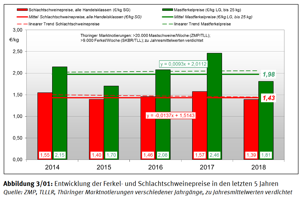 informiert Dr. Simone Müller im Tierzuchtbericht des Landes Thüringen, der soeben veröffentlicht wurde. Sie beruft sich dabei auf Analysen der Agrarmarkt Informations-Gesellschaft mbH (AMI). Da die mittleren Schlachtpreise im Mittel der letzten 5 Jahre etwa 1,43 EUR/kg betrugen, blieben von den Verkaufserlösen, abzüglich der Kosten für das Ferkel und Futter, deutlich weniger als 15 Euro übrig, informiert die Wissenschaftlerin. Das heißt, die Einnahmen waren so gering, dass innerhalb des genannten Zeitraums auch keine ausreichenden Rücklagen für Ersatzinvestitionen getätigt werden. Weiterhin bestand kein Spielraum für Investitionen in veränderte Haltungssysteme.