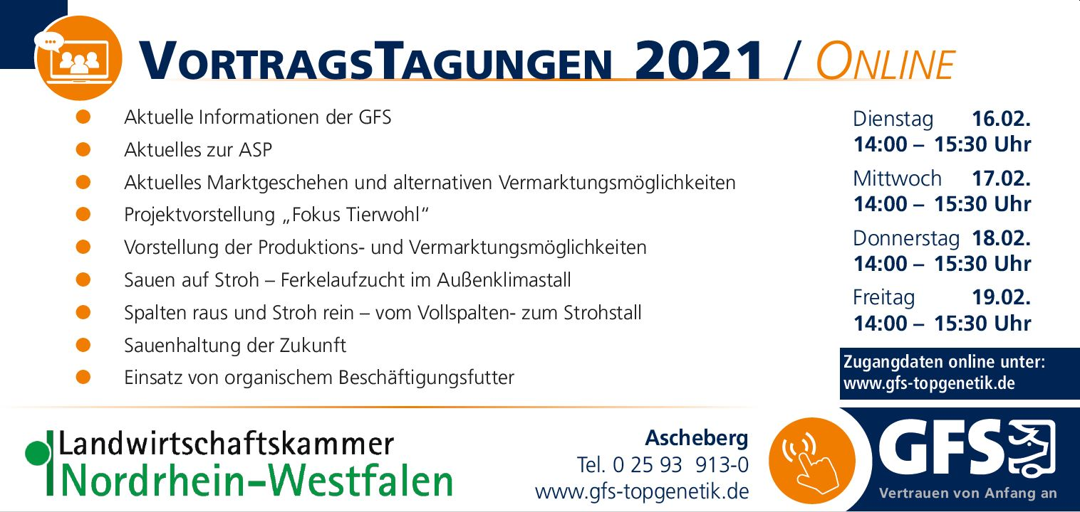 In diesem Jahr finden die Vortragstagungen von GFS, der Landwirtschaftskammer NRW und dem Netzwerk Fokus Tierwohl online statt.