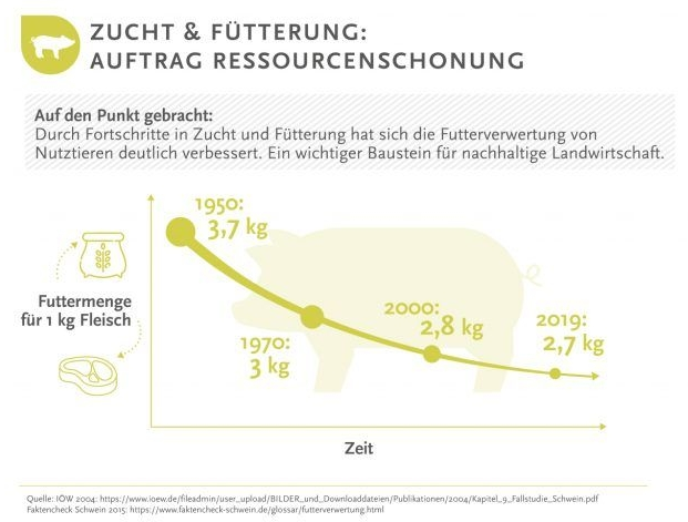 Die Haltung von Tieren für die menschliche Ernährung ist insgesamt effizienter geworden. Mehr als die Hälfte des Produktivitätsfortschritt geht auf die Züchtung zurück, vor allem im Hinblick auf die Futterverwertung. Das bedeutet, es wird weniger Futter, also weniger Ressourcen wie Ackerland, Dünger und Wasser für dieselbe Menge an Fleisch benötigt. Natürlich werden so auch Emissionen eingespart.